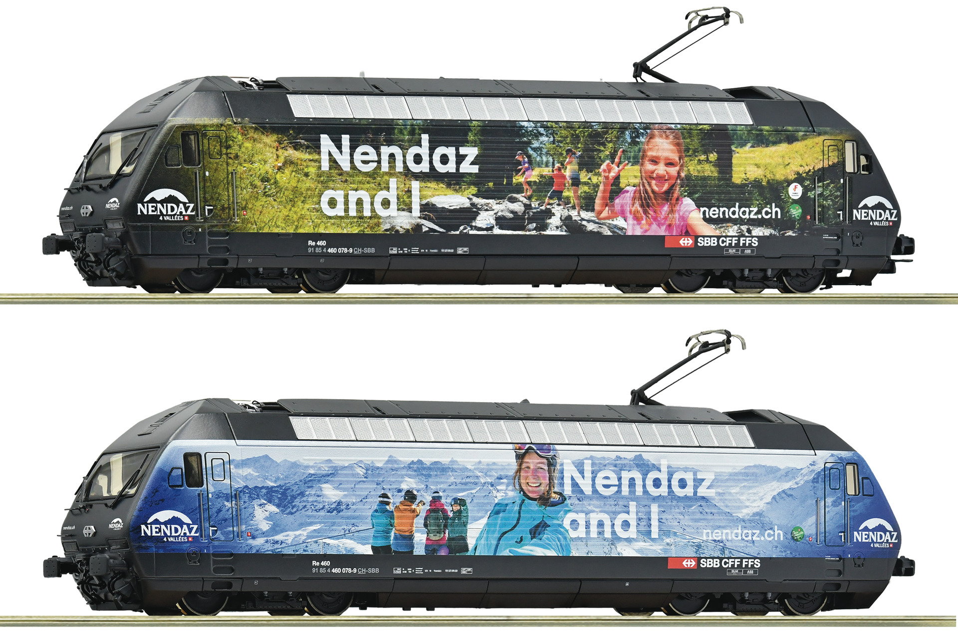 Elektrolokomotive Re 460 078 der Schweizerischen Bundesbahnen. - äNendaz und ich“-Design - Mit extra angesetztem SBB-Logo an der Front - Im Digitalbetrieb mit schaltbarem Fernlicht und einzeln schaltbarem Spitzen- oder Schlusslicht Seit Mai 2023 wirbt die Re 460 078 für eine Kampagne äSwisstainable unterwegs“ von Schweiz Tourismus. Swisstainable ist die Nachhaltigkeitsstrategie von Schweiz Tourismus und der Tourismusbranche. So soll nachhaltiges Reisen gezielt gefördert werden. Die Lokomotive trägt damit die Werbebotschaft äNendaz und ich“, für den im Wallis gelegenen Tourismusort Nendaz in die ganze Schweiz hinaus.