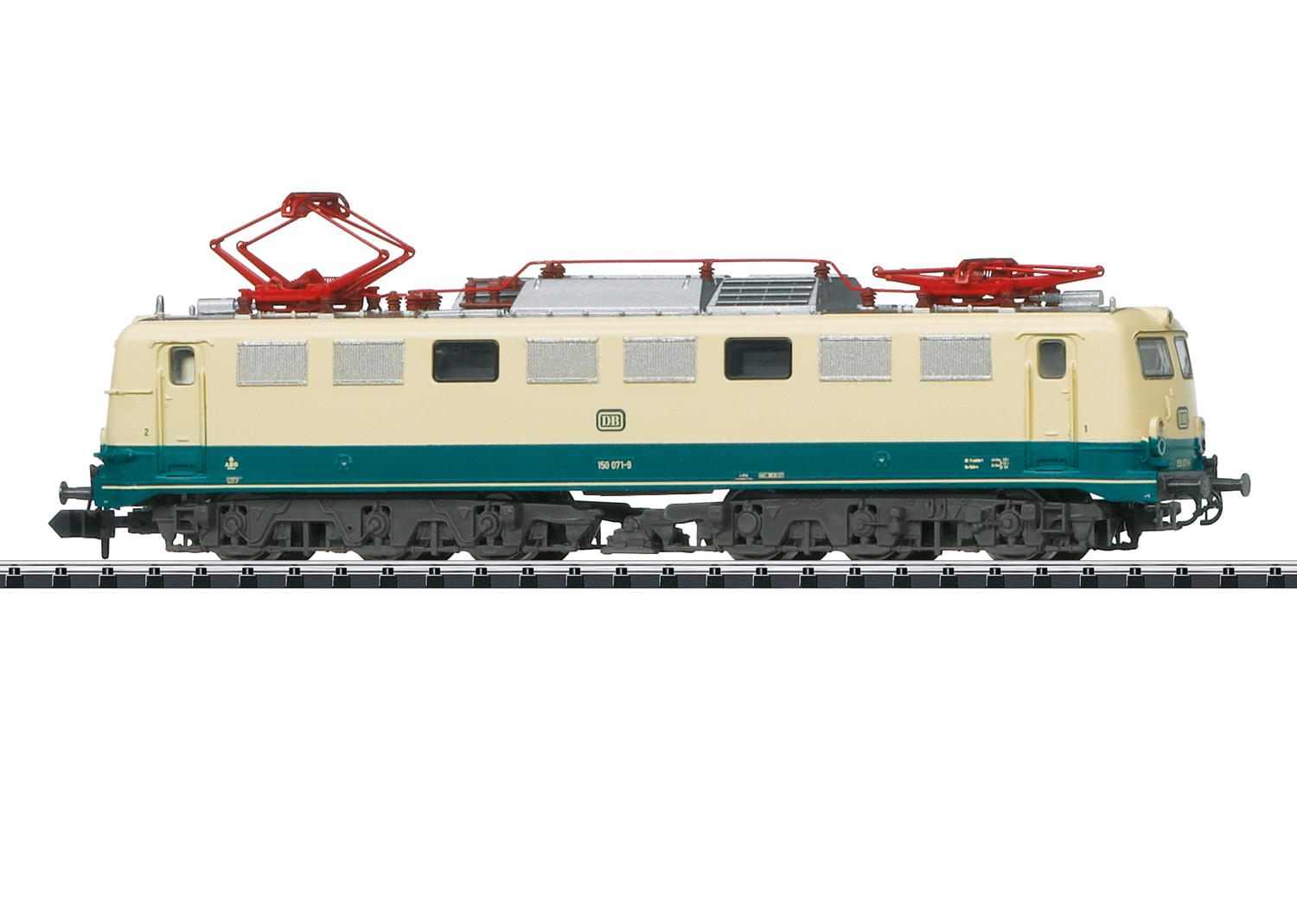 Elektrolokomotive Baureihe 150 - Im schweren GüterzugdienstVorbild: Schwere Güterzuglokomotive 150 071-9 der Deutschen Bundesbahn (DB). Klassische Farbgebung ozeanblau/elfenbein. Größte Bauart der Einheits-Elektrolokomotiven aus dem Neubauprogramm der 50er-Jahre. Umbauversion mit rechteckigen Klatte-Einzellüftern, Doppellampen und Maschinenraumfestfenstern. Unterschiedliche Haltegriffe an den Stirnseiten. Betriebszustand um 1978. Einsatz: Schwere Güterzüge und Personenzüge des Nahverkehrs.Modell: Gehäuse aus metallgefülltem Kunststoff für verbessertes Zugkraftverhalten. Eingebauter Digital-Decoder und Geräuschgenerator zum Betrieb mit mfx und DCC. Motor mit Schwungmasse, 4 Achsen angetrieben, Haftreifen. Stirnbeleuchtung und Schlusslichter mit der Fahrtrichtung wechselnd, warmweißen Leuchtdioden, Führerstandsbeleuchtung, digital schaltbar. Kinematik für Kurzkupplung. Fahrtrichtungsabhängig wechselndes Spitzensignal analog in Betrieb. Angesetzte Griffstangen. Länge über Puffer 122 mm.