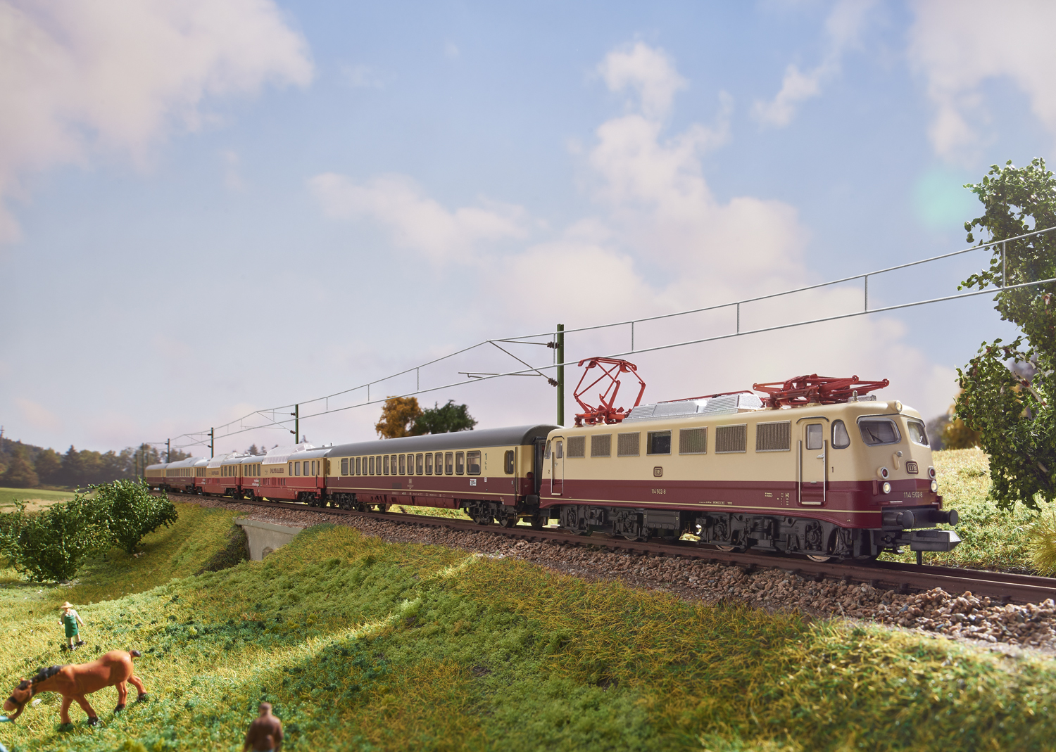 Elektrolokomotive Baureihe 114 - Modell: Eingebauter Digital-Decoder und Geräuschgenerator zum Betrieb mit mfx und DCC. Motor mit Schwungmasse, 4 Achsen angetrieben, Haftreifen. Stirnbeleuchtung und Schlusslichter mit der Fahrtrichtung wechselnd, mit warmweißen Leuchtdioden, digital schaltbar. Kinematik für Kurzkupplung. Angesetzte Griffstangen. Länge über Puffer 103 mm. Vorbild: Einheits-Elektrolokomotive 114 502-8 der Deutschen Bundesbahn (DB) mit windschnittiger Front (Bügelfalte). Achsfolge Bo´Bo´. Baujahr ab 1963. Grundfarbgebung in purpurrot/elfenbein. Betriebszustand um 1988.Einsatz: Personenzüge im Nah- und Fernverkehr und gelegentlich auch Güterverkehr. Digital-Sound mit vielen Funktionen