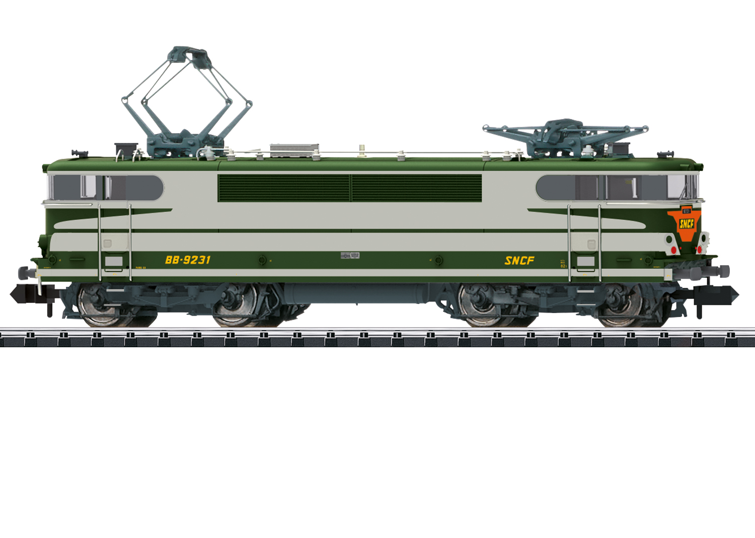 Elektrolokomotive Serie BB 9200 - Modell: Formvariante. Eingebauter Digital-Decoder und Geräuschgenerator zum Betrieb mit mfx und DCC. Motor mit Schwungmasse, 4 Achsen angetrieben, Haftreifen. Stirnbeleuchtung und Schlusslichter mit der Fahrtrichtung wechselnd, mit warmweißen Leuchtdioden, Führerstandsbeleuchtung, digital schaltbar. Kinematik für Kurzkupplung. Angesetzte Griffstangen. Fahrtrichtungsabhängig wechselndes Spitzensignal analog in Betrieb.Länge über Puffer 101 mm. Vorbild: Schnellzugelektrolokomotive BB 9231 in der besonderen Farbgebung Arzens der Französischen Staatseisenbahnen (SNCF). Betriebszustand um 1985. Baujahr ab 1957. Digital-Sound mit vielen Funktionen