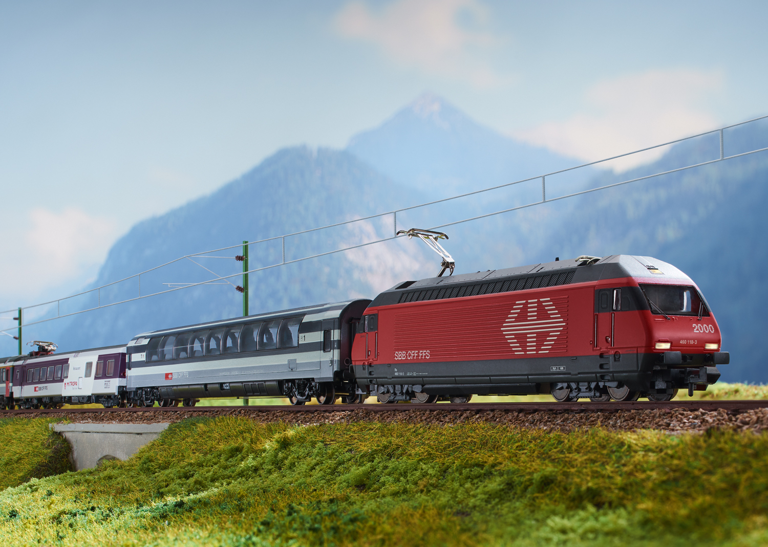 Modell: Eingebauter Digital-Decoder und Geräuschgenerator zum Betrieb mit mfx und DCC. Motor mit Schwungmasse, 4 Achsen angetrieben, Haftreifen. Stirnbeleuchtung und Schlusslichter mit der Fahrtrichtung wechselnd, mit warmweißen Leuchtdioden, Führerstandsbeleuchtung, digital schaltbar. Mit NEM-Kupplungsschacht. Länge über Puffer 115 mm. Vorbild: Schnelle Mehrzwecklokomotive Serie Re 460 der Schweizerischen Bundesbahnen (SBB/CFF/FFS). Namenslok 460 118-3 Gotthard/Gottardo. Betriebszustand um 2002.Einsatz: Reisezüge. Im Zug durch EuropaEinst reiste man luxuriös im TEE von München nach Paris oder von Zürich nach Mailand. In der 1. Klasse selbstverständlich. Doch dieses Konzept überholte sich selbst. Um gegenüber Straße und Luft konkurrenzfähig zu bleiben, mussten die europäischen Bahnverwaltungen entscheidend handeln. Der Reiseverkehr in Europa hatte sich verändert. Mehr Mitglieder in der Europäischen Union und demzufolge offene Grenzen sorgten für neue Herausforderungen. Denn internationale Züge waren nun mehr denn je gefragt. Es gab zwar schon ab 1980 internationale Verbindungen durch Europa, allerdings führten sie noch nicht den Namen EC, sondern liefen als IC. Die Bilanz der ersten Jahre war durch und durch erfreulich. Folglich beschlossen die Mitgliedsstaaten der Europäischen Union unter Einbeziehung der SBB und ÖBB, ein Qualitätsnetz aufzubauen. Und bald war ein neues Produkt geboren, der EuroCity/EC. Auch ein neues Logo wurde entwickelt, denn bislang waren die internationalen Züge nicht so eindeutig zu erkennen. Am 31. Mai 1987 fiel der Startschuss. Von den teilnehmenden Bahnverwaltungen waren bestimmte Qualitätsstandards einzuhalten. So muss ein Speisewagen oder zumindest ein Barwagen mit dabei sein. Die Wagen der 1. und 2. Klasse verfügen über eine Klimaanlage. Auch das Personal wurde besonders geschult. Das Netz wuchs und wuchs und wurde vom Publikum bestens angenommen. Als ganz besonderes Glanzlicht führen bis heute einige EC-Züge sogar die grandiosen Aussichtswagen der SBB mit, wie zum Beispiel der äTransalpin“ auf seiner Fahrt von Zürich nach Graz. Aber auch auf der guten alten Gotthard-Bergstrecke waren einst EC-Züge mit Panoramawagen zu sehen. Eine Fahrt mit ihnen durch die wunderbare Welt der Alpen in den sonnigen Süden dürfte sicherlich ein ganz besonderes Reiseerlebnis gewesen sein. Mit Digital-Decoder DCC/mfx.Schweizer Lichtwechsel.Viele Sound- und Schaltfunktionen.Spitzensignal mit warmweißen LEDs.