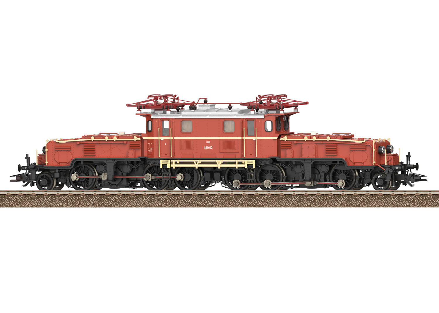 Elektrolokomotive Reihe 1189 - Bereits in den 1920er Jahren entschlossen sich die österreichischen Bundesbahnen (BBÖ), die wichtigsten Strecken so schnell wie möglich zu elektrifizieren. Speziell für die Rampen in den Bergen wurden die nach Schweizer Vorbild entwickelten sieben Gebirgs-Schnellzugsloks der Reihe 1100 (bei den ÖBB: Reihe 1089) in Jahren 1923/24 an die BBÖ geliefert. Die 20.350 mm langen Maschinen bestanden aus zwei kurzgekuppelten Triebgestellen, auf denen eine kurze Maschinenbrücke mit Transformator, Schlittenschaltwerk und zwei Führerständen gelenkig gelagert war. Aufgrund ihrer langen, niedrigen und schmalen Vorbauhauben auf den Triebgestellen bürgerte sich schnell der Name äKrokodil“ ein, wobei diese Maschinen von allen äKrokodilen“ am äkrokodilmäßigstenö aussahen. Da sie sich bestens bewährten erfolgte 1926/27 die Auslieferung von neun Nachbauten als 1100.101-109 (ÖBB: 1189.01-09), die aufgrund einer geänderten Getriebeübersetzung eine höhere Geschwindigkeit erreichten und mit stärkeren Motoren ausgestattet waren.Vorbild: Elektrolokomotive Reihe 1189 Österreichisches Krokodil der Österreichischen Bundesbahnen (ÖBB). Blutorange Grundfarbgebung. Betriebsnummer 1189.02. Betriebszustand Mitte/Ende der 1970er-Jahre.Modell: Mit Digital-Decoder und umfangreichen Geräusch- und Lichtfunktionen. Geregelter Hochleistungsantrieb mit Schwungmasse, zentral eingebaut. Jeweils 2 Treibräder in den beiden Treibgestellen über Kardan angetrieben. Haftreifen. Kurvengängiges Gelenkfahrwerk. Fahrtrichtungsabhängig wechselndes Dreilicht-Spitzensignal und ein rotes Schlusslicht konventionell in Betrieb, digital schaltbar. Beleuchtung umschaltbar auf ein weißes Schlusslicht. Spitzensignal an Lokseite 2 und 1 jeweils separat digital abschaltbar. Doppel-A-Licht-Funktion. Führerstands- und Maschinenraumbeleuchtung jeweils separat digital schaltbar. Beleuchtung mit wartungsfreien warmweißen und roten Leuchtdioden (LED). Hochdetaillierte Metall-Ausführung mit vielen separat angesetzten Details. Bremsschläuche und Schraubenkupplungsimitationen liegen als separat ansteckbare Teile bei. Länge über Puffer ca. 23,4 cm.Passende Güterwagen-Sets finden Sie unter der Artikelnummer 24121 und unter der Artikelnummer 46231 im Märklin H0-Sortiment mit dem Hinweis auf die benötigten Tauschradsätze. Diese Wagen-Sets werden im Jahr 2024 mit neuen Betriebsnummern aufgelegt.Dieses Modell finden Sie in Wechselstromausführung im Märklin H0-Sortiment unter der Artikelnummer 39090.
