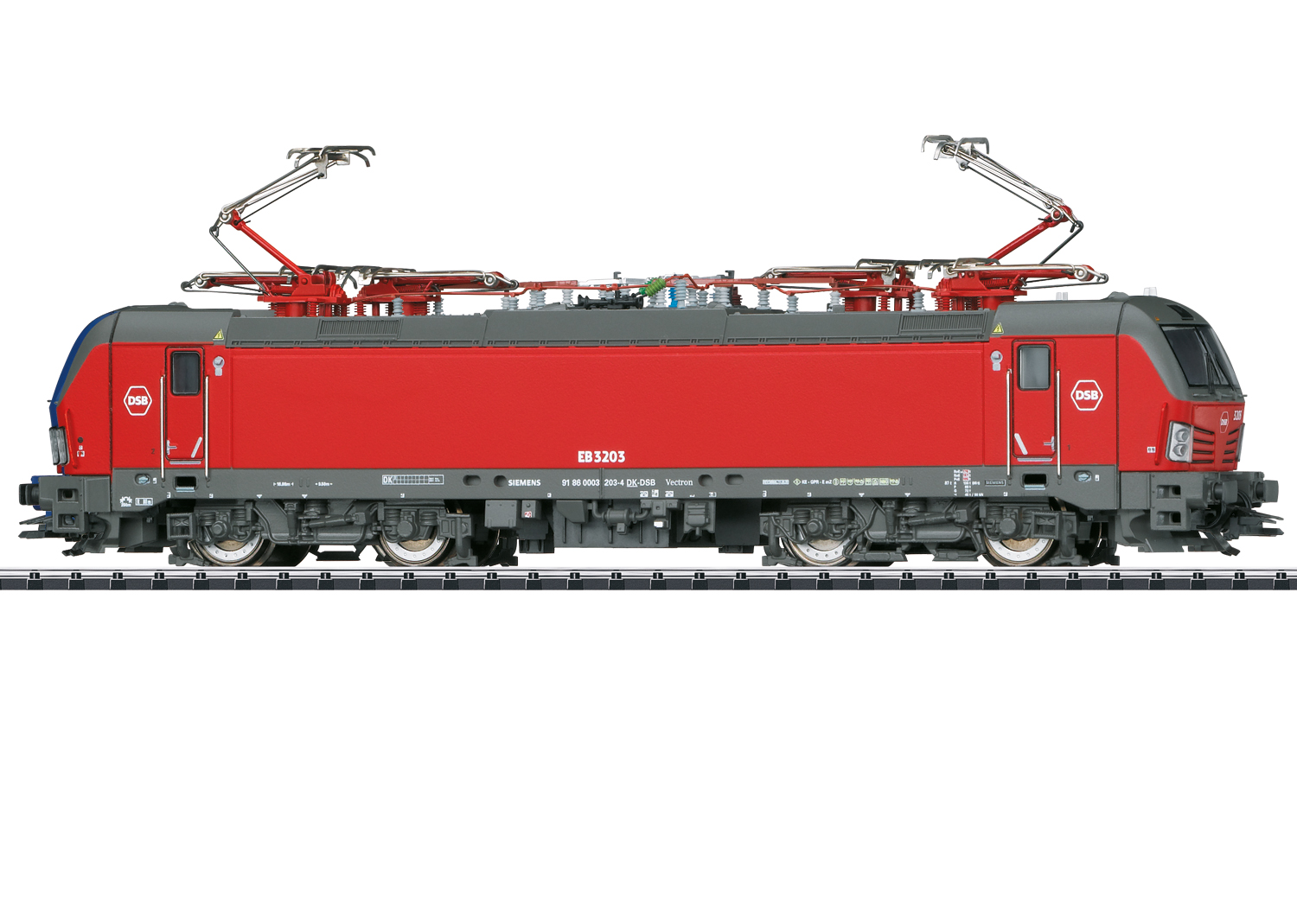 Vorbild: Elektrolokomotive EB 3200 (Vectron) der Dänischen Staatsbahnen (DSB). Betriebsnummer 3203. Betriebszustand 2020. Modell: Mit Digital-Decoder und umfangreichen Geräuschfunktionen. Geregelter Hochleistungsantrieb. 4 Achsen angetrieben. Haftreifen. Fahrtrichtungsabhängig wechselndes Dreilicht-Spitzensignal und 2 rote Schlusslichter konventionell in Betrieb, digital schaltbar. Spitzenlicht an Lokseite 2 und 1 jeweils separat digital abschaltbar. Wenn Spitzensignal an beiden Lokseiten abgeschaltet ist, dann beidseitige Funktion des Doppel-A-Lichts. Fernscheinwerfer separat schaltbar. Führerstandsbeleuchtung digital schaltbar. Lichtfunktionen Rangier-Sonderzeichen und Falschfahrt digital schaltbar. Beleuchtung mit wartungsfreien warmweißen und roten Leuchtdioden (LED). Ansteckbare Bremsschläuche liegen separat bei. Länge über Puffer 21,9 cm. Ein passendes Personenwagenset finden Sie im Märklin H0-Sortiment unter der Artikelnummer 43599.Dieses Modell finden Sie in Wechselstromausführung im Märklin H0-Sortiment unter der Artikelnummer 39331.
