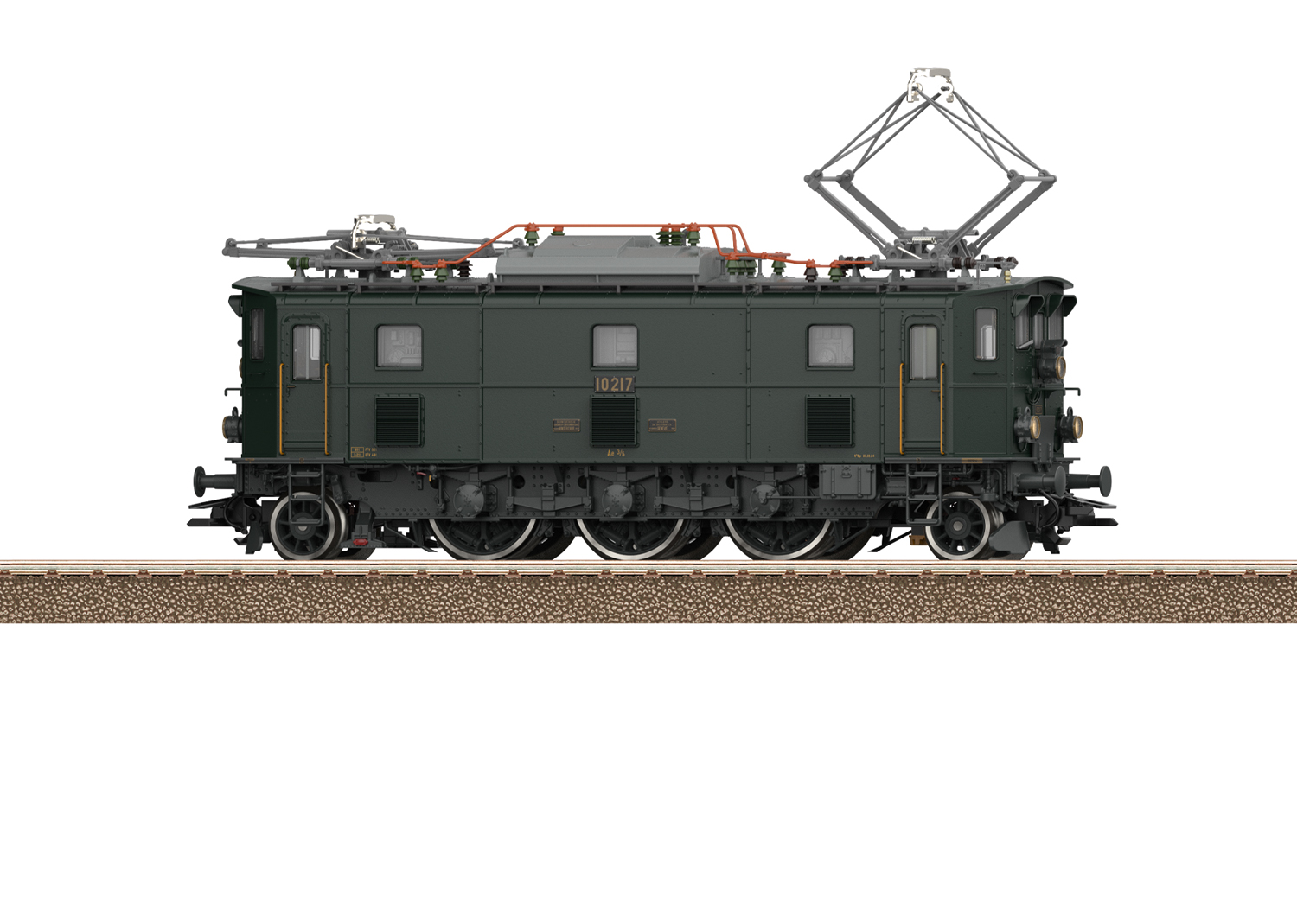 Elektrolokomotive Ae 3/5 Vorbild: Elektrolokomotive Ae 3/5 der Schweizerischen Bundesbahnen (SBB/CFF/FFS). Mit stirnseitigen Übergangsblechen und Falschfahrsignal über dem oberen Spitzensignal. Tannengrüne Grundfarbgebung mit grauem Fahrwerk. Lok-Betriebsnummer 10217. Betriebszustand 2022. Modell: Mit Digital-Decoder und umfangreichen Licht- und Geräuschfunktionen. Geregelter Hochleistungsantrieb mit Schwungmasse. Eine Achse angetrieben. Haftreifen. Fahrtrichtungsabhängig wechselndes Dreilicht-Spitzensignal und 1 weißes Schlusslicht (Schweizer Lichtwechsel) konventionell in Betrieb, digital schaltbar. Beleuchtung umschaltbar bei Solofahrt auf 1 rotes Schlusslicht. Falschfahrsignal separat digital schaltbar. Spitzensignal an Lokseite 2 und 1 jeweils separat digital abschaltbar. Doppel-A-Licht-Funktion. Zusätzliche Führerstandbeleuchtung, Führerpultbeleuchtung, Blitzen am Schaltwerk und Maschinenraumbeleuchtung jeweils separat digital schaltbar. Beleuchtung mit wartungsfreien warmweißen und roten Leuchtdioden (LED). Mit Pufferspeicher. Hochdetaillierte Metall-Ausführung mit vielen separat angesetzten Einzelheiten. Führerstand- und Maschinenraum-Nachbildung. Detaillierte Dachausrüstung mit Dachleitungen, Isolatoren und Dachlaufbrettern sowie Scherenstromabnehmer. Befahrbarer Mindestradius 360 mm. Bremsschläuche und Schraubenkupplungsimitationen liegen bei.Länge über Puffer ca. 12,8 cm. Passende Personenwagen finden Sie im Märklin H0-Sortiment unter der Artikelnummer 43363, 43373 und 43383.Dieses Modell finden Sie in Wechselstromausführung im Märklin H0-Sortiment unter der Artikelnummer 38350.