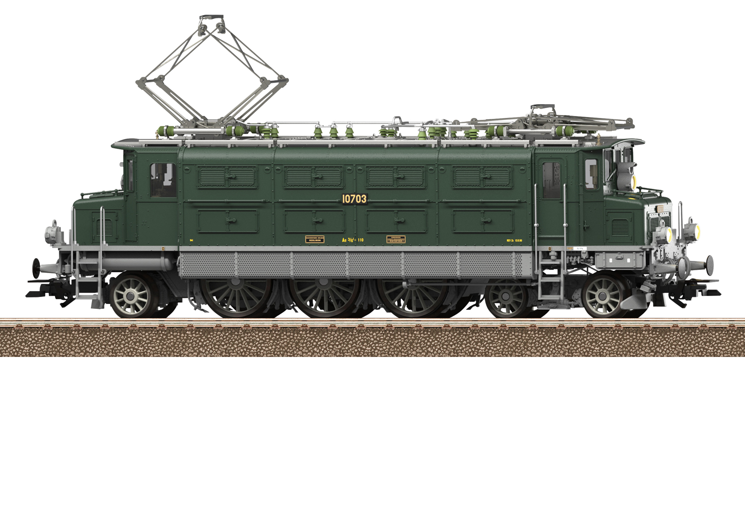 Elektrolokomotive Ae 3/6 I - Modell: Mit Digital-Decoder und umfangreichen Geräusch- und Lichtfunktionen. Geregelter Hochleistungsantrieb mit Schwungmasse. Alle 3 Treibräder angetrieben. Haftreifen. Fahrtrichtungsabhängig wechselndes Dreilicht-Spitzensignal und 1 weißes Schlusslicht (Schweizer Lichtwechsel) konventionell in Betrieb, digital schaltbar. Beleuchtung umschaltbar bei Solofahrt auf 1 rotes Schlusslicht. Fahrberechtigungssignal separat digital schaltbar. Spitzensignal an Lokseite 2 und 1 jeweils separat digital abschaltbar. Doppel-A-Licht-Funktion. Zusätzliche Führerstandsbeleuchtung und Maschinenraumbeleuchtung jeweils separat digital schaltbar. Beleuchtung mit wartungsfreien warmweißen und roten Leuchtdioden (LED). Hochdetaillierte Metall-Ausführung mit vielen separat angesetzten Einzelheiten, wie Kühlröhren für das Transformatorenöl. Führerstand- und Maschinenraum-Nachbildung. Detaillierte Dachausrüstung mit Dachleitungen, Isolatoren und Dachlaufbrettern sowie Scherenstromabnehmer. Befahrbarer Mindestradius 360 mm. Bremsschläuche und Schraubenkupplungsimitationen liegen bei. Länge über Puffer 16,9 cm. Vorbild: Elektrolokomotive Ae 3/6 I der Schweizerischen Bundesbahnen (SBB). Lokomotive aus dem achten Baulos. Tannengrüne Grundfarbgebung mit grauem Fahrwerk. Mit Stangenpuffer, stirnseitigen Übergangsblechen und 4 seitlichen Führerstandstüren. Falschfahrsignal über der jeweils oberen Lampe. Lokomotive für den Einsatz vor Leichtschnellzügen im Flachland, auf der Strecke Genf-Bern-Zürich. Lok-Betriebsnummer 10703. Betriebszustand Anfang der 1950er Jahre. Das passende Leichtstahlwagen-Set finden Sie unter der Artikelnummer 23134 im Trix H0-Sortiment. Dieses Modell finden Sie in Wechselstromausführung im Märklin H0-Sortiment unter der Artikelnummer 39360. Komplette NeukonstruktionHochdetaillierte MetallausführungDigital-Decoder mit umfangreichen Betriebs- und GeräuschfunktionenFührerstand- und Maschinenraumbeleuchtung digital schaltbarZusätzlich rotes Fahrberechtigungssignal digital schaltbar