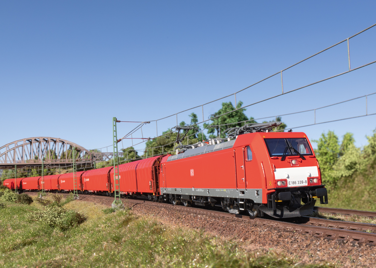 Elektrolokomotive Baureihe 186 - Vorbild: Elektrolokomotive Baureihe 186 der Deutschen Bahn AG. Verkehrsrote Grundfarbgebung. Betriebsnummer 186 339-8. Betriebszustand ab 2019.Modell: Mit Digital-Decoder und umfangreichen Geräuschfunktionen. Geregelter Hochleistungsantrieb mit Schwungmasse, zentral eingebaut. Alle vier Achsen über Kardan angetrieben. Haftreifen. Fahrtrichtungsabhängig wechselndes Dreilicht-Spitzensignal und zwei rote Schlusslichter konventionell in Betrieb, digital schaltbar. Fernlicht zuschaltbar. Spitzensignal an Lokseite 2 und 1 jeweils digital separat abschaltbar. Doppel-A-Licht-Funktion. Führerstands- und Führerpultbeleuchtung jeweils separat digital schaltbar. Beleuchtung mit wartungsfreien warmweißen und roten Leuchtdioden (LED). Mit Pufferspeicher. Viele separat angesetzte Teile wie Griffstangen, Sandkästen, UIC-Steckdosen und Dachleitungen. Detailliert ausgeführte Dachaufbauten mit vier neu konstruierten Stromabnehmern mit unterschiedlichen Schleifstücken für den Einsatz in Deutschland, Frankreich und Belgien. Pufferhöhe nach NEM. Bremsleitungen, Schraubenkupplungen, Steckdosen und geschlossene Schienenräumer liegen als separat ansteckbare Teile bei. Länge über Puffer 21,7 cm.Passende Güterwagen der Epoche VI finden Sie im Trix- und Märklin H0-Sortiment.Dieses Modell finden Sie in Wechselstromausführung im Märklin H0-Sortiment unter der Artikelnummer 38800.