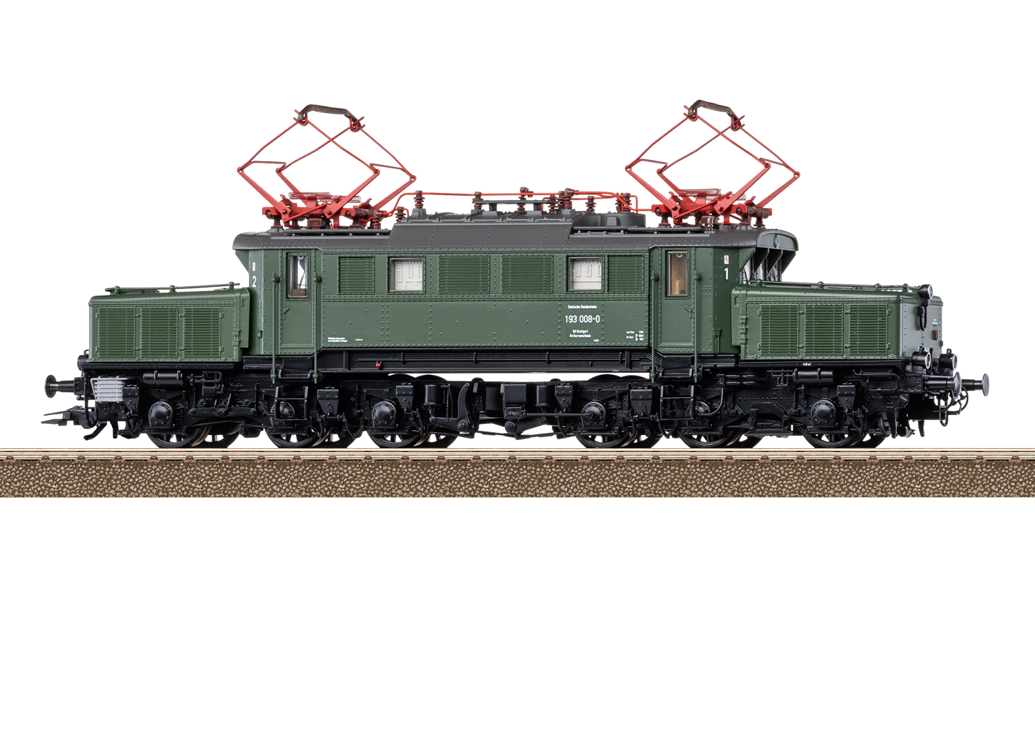 Elektrolokomotive Baureihe 193 - Kraftpaket für die Geislinger SteigeVorbild: Schwere Güterzug-Elektrolokomotive Baureihe 193 der Deutschen Bundesbahn (DB). Chromoxidgrüne Grundfarbgebung. 6 Sandkästen, Anfahrlampe und Indusi. Lok-Betriebsnummer 193 008-0. BD Stuttgart, Bw Kornwestheim. Betriebszustand um 1976.Modell: Mit Digital-Decoder und umfangreichen Geräusch- und Lichtfunktionen. Geregelter Hochleistungsantrieb mit Schwungmasse, zentral eingebaut. Jeweils 2 Achsen in jedem Treibgestell über Kardan angetrieben. Haftreifen. Fahrtrichtungsabhängig wechselndes Dreilicht-Spitzensignal und zwei rote Schlusslichter konventionell in Betrieb, digital schaltbar. Spitzensignal an Lokseite 2 und 1 jeweils digital separat abschaltbar. Wenn Spitzensignal an beiden Lokseiten abgeschaltet ist, dann beidseitige Funktion des Doppel-A-Lichtes. Führerstandsbeleuchtung fahrtrichtungsabhängig digital schaltbar. Zusätzlich kann eine Anfahrlampe fahrtrichtungsabhängig digital geschaltet werden. Beleuchtung mit wartungsfreien warmweißen und roten Leuchtdioden (LED). Angesetzte Griffstangen. Führerstände und Maschinenraum mit Relief-Inneneinrichtung. Ansteckbare Bremsschläuche und Kupplungshaken liegen separat bei. Länge über Puffer 20,3 cm.Ein passendes Güterwagen-Set finden Sie im Märklin H0-Sortiment unter der Artikelnummer 47371, mit Hinweis zum Radsatztausch auf Gleichstromradsätze.Dieses Modell finden Sie in Wechselstromausführung im Märklin H0-Sortiment unter der Artikelnummer 37873.