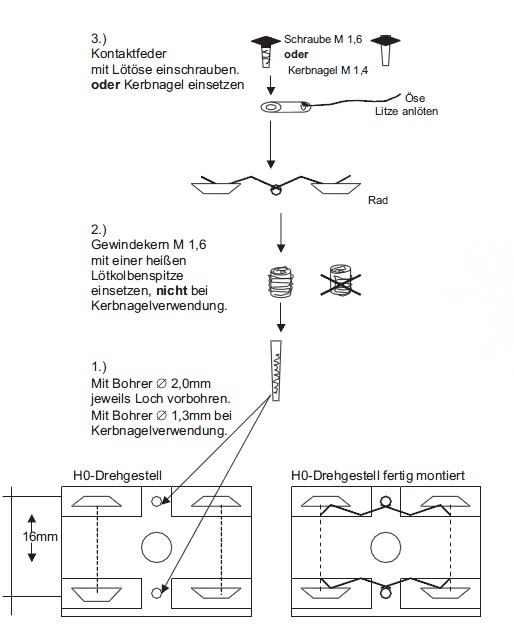 Die Kontaktsätze optimieren die Stromzuführung der Wagen (ggf. auch Lokomotiven) und sorgen für eine weitestgehend flackerfreie Innen- und Zugschlussbeleuchtung. Der über eine justierbare Federwirkung vorgespannte Kontaktsatz aus Draht legt sich an die Rückseite des Rades (Spurkranz) und sorgt für eine optimale Kontaktierung.
