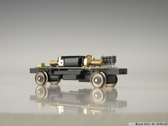 Motorisiertes Fahrgestell 2-achs. Zweileiter-Gleichstrom. Digitale Schnittstelle: NEM 651. Achsstand 51,8 mm.