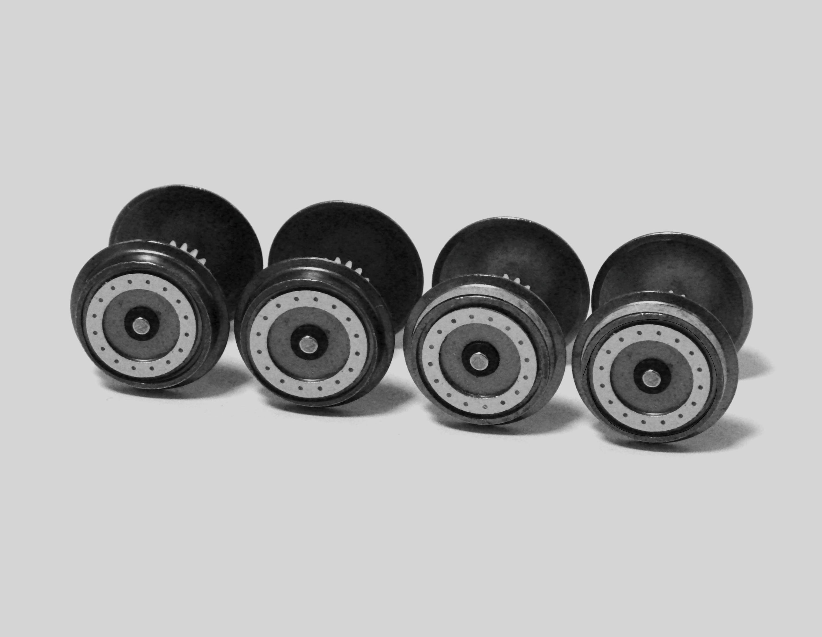 Profilierte und bedruckte Radsätze (kompletter Satz für eine vierachsige Lokomotive vom Typ Vectron - Dieselausführung). AC Ausführung.