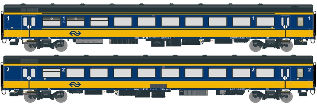 2-er Set NS ICRm Garnitur 1 für den Innenlandseinsatz Reisezugwagen Apmz10 und Reisezugwagen Bpmz10 ( Neue Farbe Gelb / Blau) Epoche VI - Passende AC Achsen: EX60003