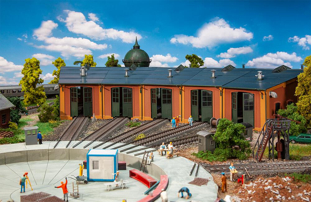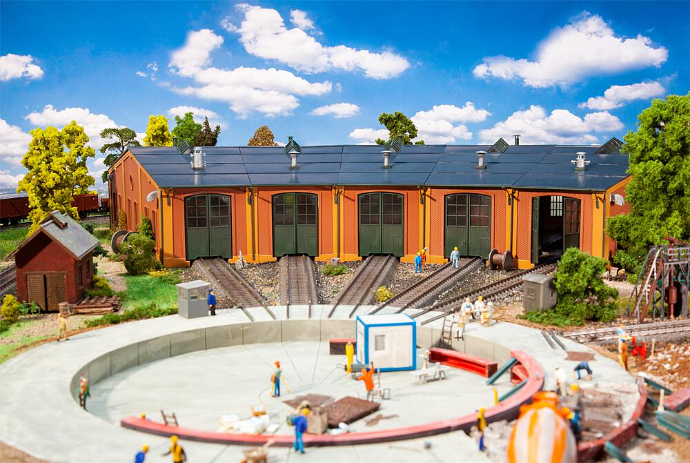 Für die Stationierung Ihrer Loks. 3-ständiges, erweiterbares Lok-Ringdepot für die Angliederung an Drehscheiben mit einem Abgangswinkel von 12°. Tragwerk und Sichtmauerwerk des Backsteinbaus sind farblich abgesetzt. Die Seitenwände sind mit je sieben Fenstern und jeder Schuppenstand mit drei rückwärtigen Fenstern, Rauchabzug, Oberlicht und Schornsteinkopf ausgestattet. Antriebsteile und Anlenkdraht für die Bewegung der Tore mit einem Servo enthalten (Servo, Art. 180726 separat erhältlich). Unterstand bis 290 mm LüP. Torhöhe SUK: 72 mm. Modell für alle herkömmlichen Gleissysteme geeignet.
