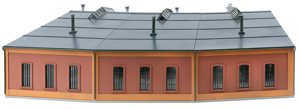 Erweiterbar mit »Ergänzungs-Set für Ringlokschuppen mit 12°-Teilung«, Art. 120282. Für einen Halbkreisschuppen benötigen Sie: 1 x Art. 120281, 6 x Art. 120282.
