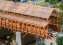 Gedeckte, zu den Seiten hin offene Eisenbahn-Holzbrücke mit einem Steinpfeiler und beidseitigen Steinbrücken als Widerlager.