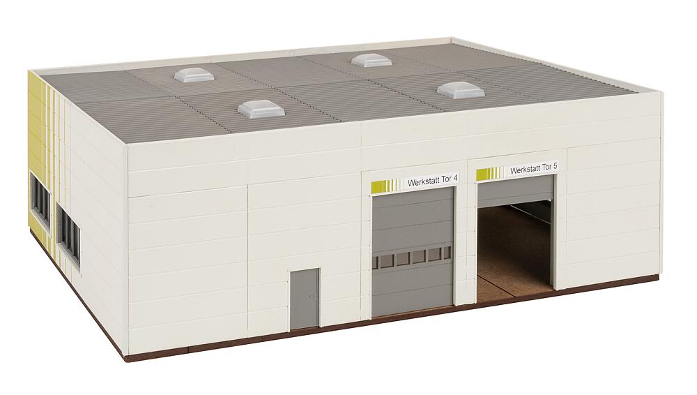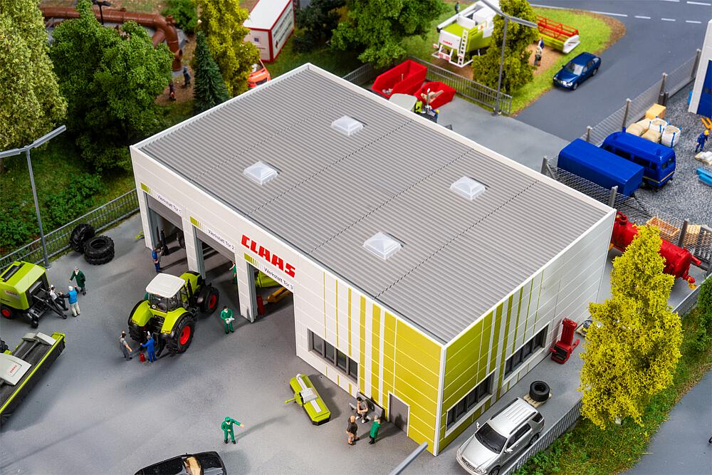 Diese moderne Landmaschinenwerkstatt mit ihren drei Toren ist hervorragend geeignet für große Fahrzeuge und deren Anhänger. Sie ist eine Anlehnung an das Original der Firma »CLAAS« und verfügt über eine digital bedruckte Fassade nach Originalvorbild. Perfekt, um den Traktoren und Landmaschinen der Miniatur-Landwirte ein Zuhause zu geben und die Modellbauanlage mit etwas ländlichem Flair zu verschönern. Die Landmaschinenwerkstatt ist für die Durchfahrt mit Car System-Fahrzeugen geeignet.