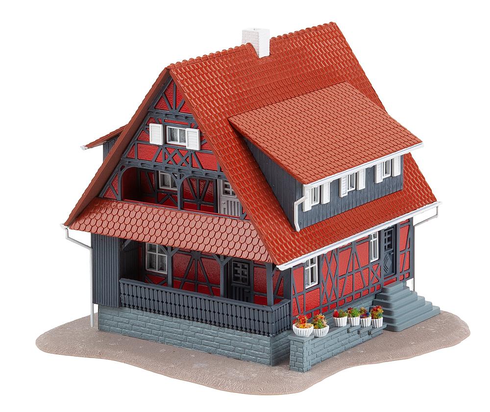 1-stöckiges Wohnhaus in Fachwerkbauweise mit grauen Balken und roter Ausfachung. Zwei Dachloggien, zwei große Gauben und die überdachte Veranda schmücken das kleine Gebäude mit Steinsockel, dessen Eingang über eine Außentreppe erreicht wird. Für die Szenenausgestaltung liegen ein Brunnen, ein kleiner Obelisk und Blumentröge bei.