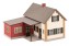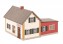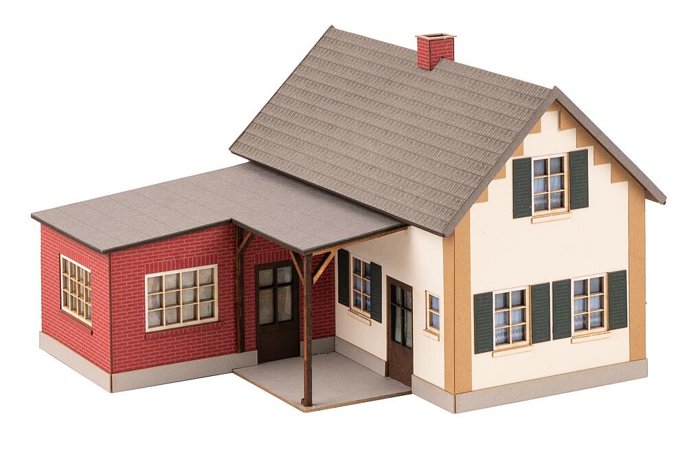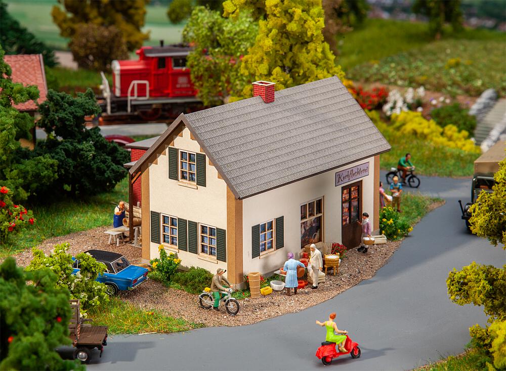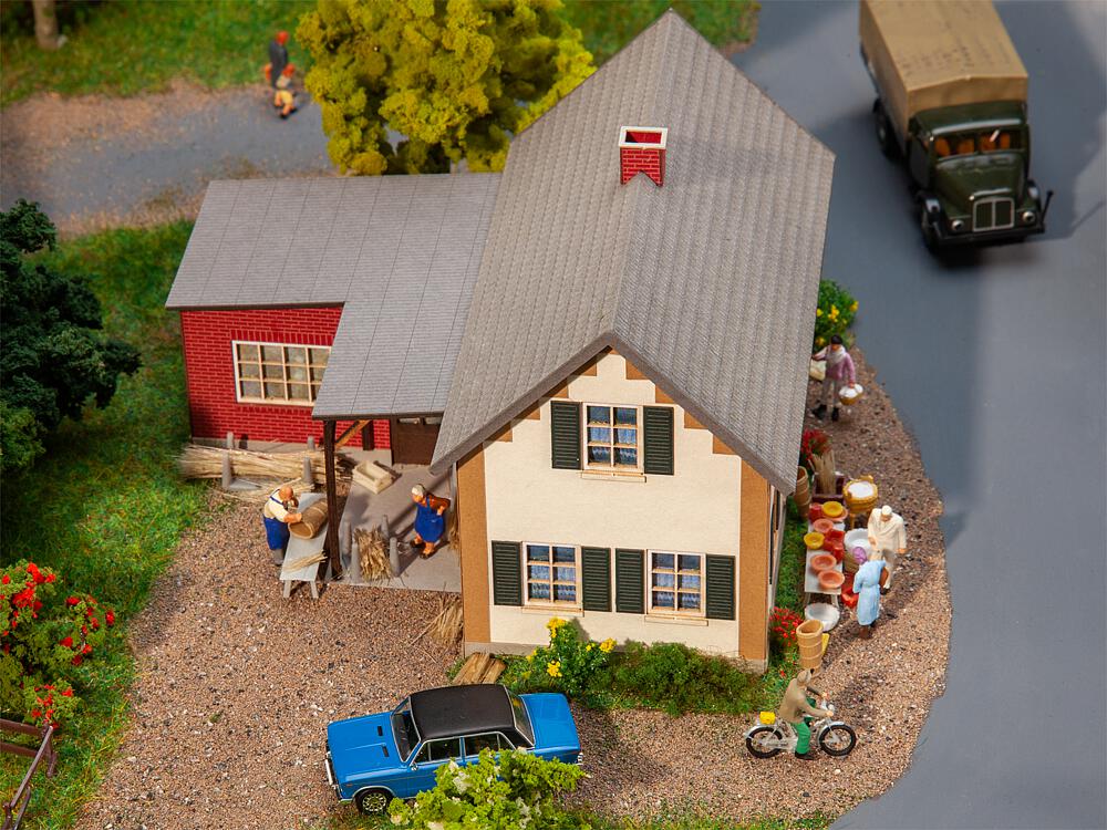 Lasercut-Modell einer Korbflechterei in einem einstöckigen Haus mit Sprossenfenstern, Fensterläden, Satteldach mit verziertem Giebel und einem kleinen Werkstattanbau in Ziegelbauweise. Die beiden Gebäudeeingänge schützt eine gemeinsame Überdachung.