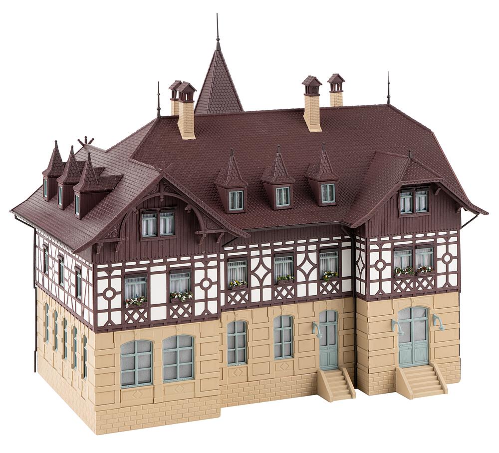 Wellness! Kleine, repräsentative Fachklinik in einem Gebäude mit Turmvorbau, überdachten Eingängen und aufwändig gestalteten Straßenfassaden aus der Zeit der Jahrhundertwende 1900. Das Erdgeschoss und die Außenstufen sind gemauert, das Obergeschoss in Fachwerkbauweise ausgeführt und das Dachgeschoss mit Holz verkleidet.