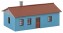 Blau verputztes Ferienhaus, eingeschossig, mit längsrechteckigem Grundriss, Holzgiebeln und flach geneigtem Satteldach.