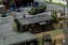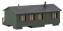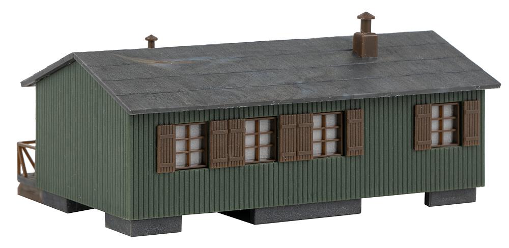 Einstöckige Holzbaracke mit Laubengang und überdachtem Eingang.