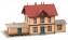 Zweigeschossiges Empfangsgebäude mit grobem Fassadenputz, Stockwerkgesims und einer Holzverschalung im Dach- und Obergeschoss. Ein Güterschuppen mit umlaufender Rampe und ein Fahrradunterstand ergänzen als seitliche Anbauten die Station.