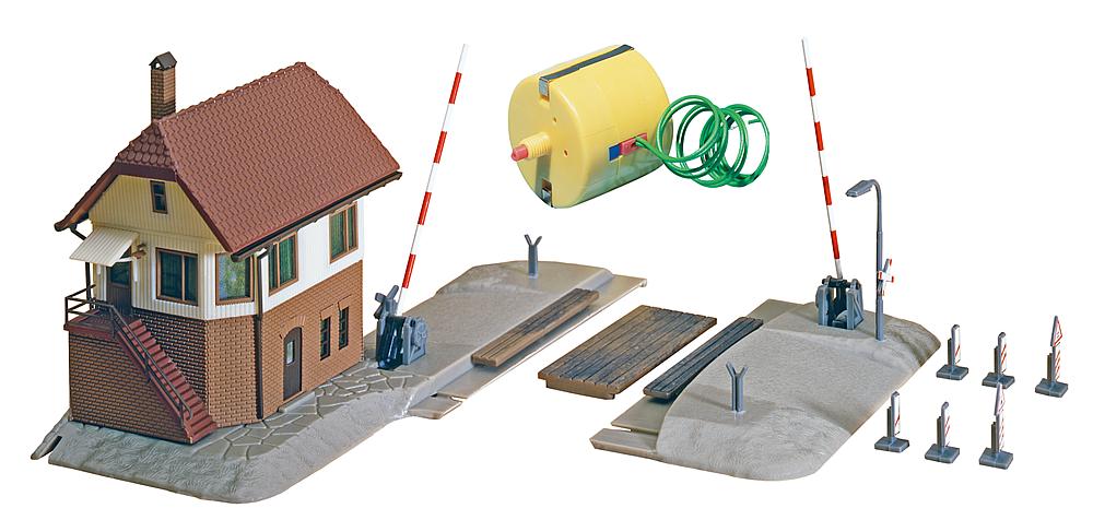Dieser Bahnübergang ist mit einem Elektroantrieb ausgerüstet, der die Schranken geräuschlos und realistisch langsam öffnet und schließt. Der Übergang kann in ein- und mehrgleisige Geraden und Bogen aller Gleisarten eingebaut werden. (12?16 V Wechselspannung, 60 mA). Dieser Bausatz enthält: 90 Einzelteile in 7 Farben, 1 Antriebsmotor, 1 Deko und 1 Bauanleitung.