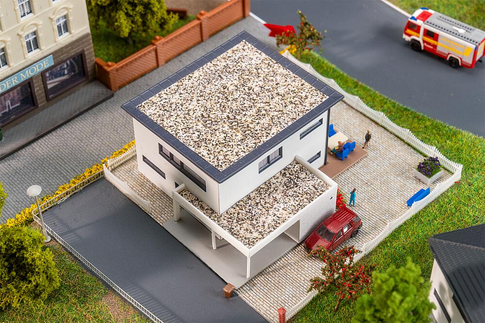 Dieses Miniaturmodell einer WeberHaus-Villa ist mit seiner strahlend weißen Fassade, einem eleganten grauen Akzent, dem zeitgemäßen Flachdach und den großzügigen Fenstern ein wahrer Blickfang für Liebhaber moderner Architektur. Es modernisiert jede Vorstadt und bringt frischen Wind in die Modellbauanlage.
