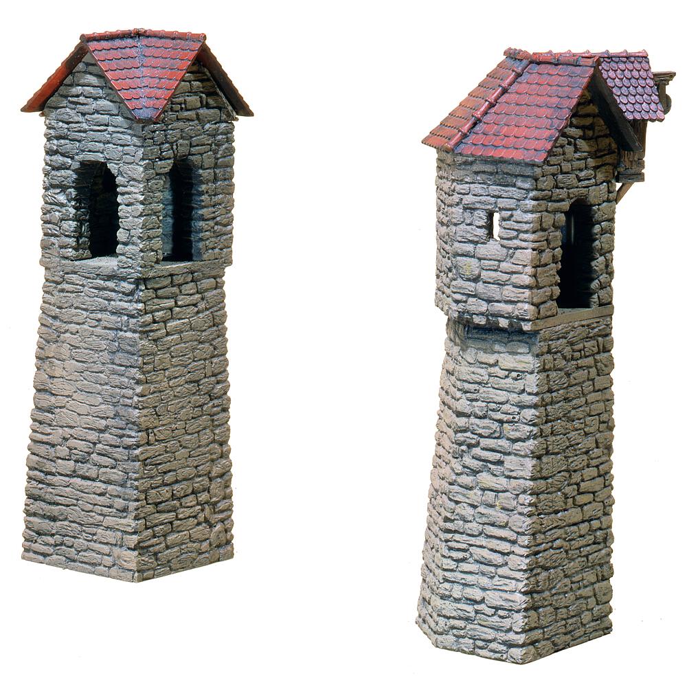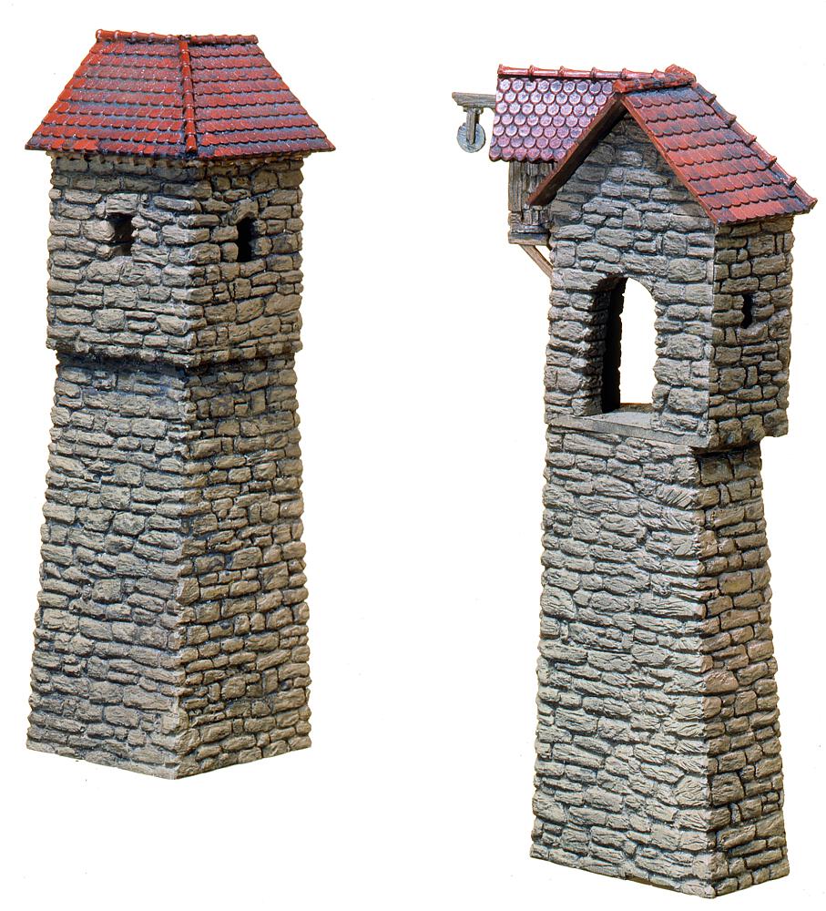 Epoche I - Altstadtmauer-Wehrtürme 45°: 33 x 25 x 69 mm - Altstadtmauer-Wehrtürme 90°: 22 x 21 x 69 mm - Altstadtmauer: 85 x 20 x 69 mm (3 x) - Altstadtmauerstück: 24 x 13 x 59 mm (3 x) - Brunnen: 26 x 26 x 30 mm - Turm: 55 x 48 x 220 mm