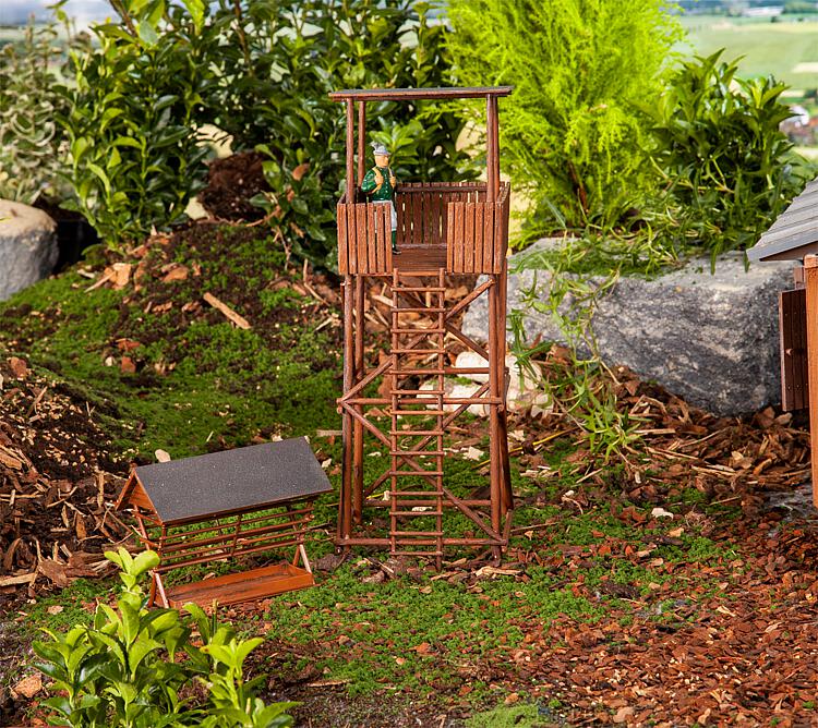 In Holzbauweise gefertigter, überdachter Jägerhochsitz mit einer passenden Futterkrippe für die Wildfütterung.