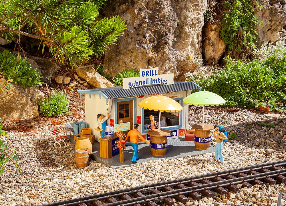 Verkaufsstand auf rechteckigem Grundriss, mit weißer Fassade und großem Schaufenster. Eine Bodenplatte, zwei Stehtische mit Sonnenschirmen sowie passende Küchenausstattungs- und Ausschmückungsteile sind im Bausatzumfang enthalten.