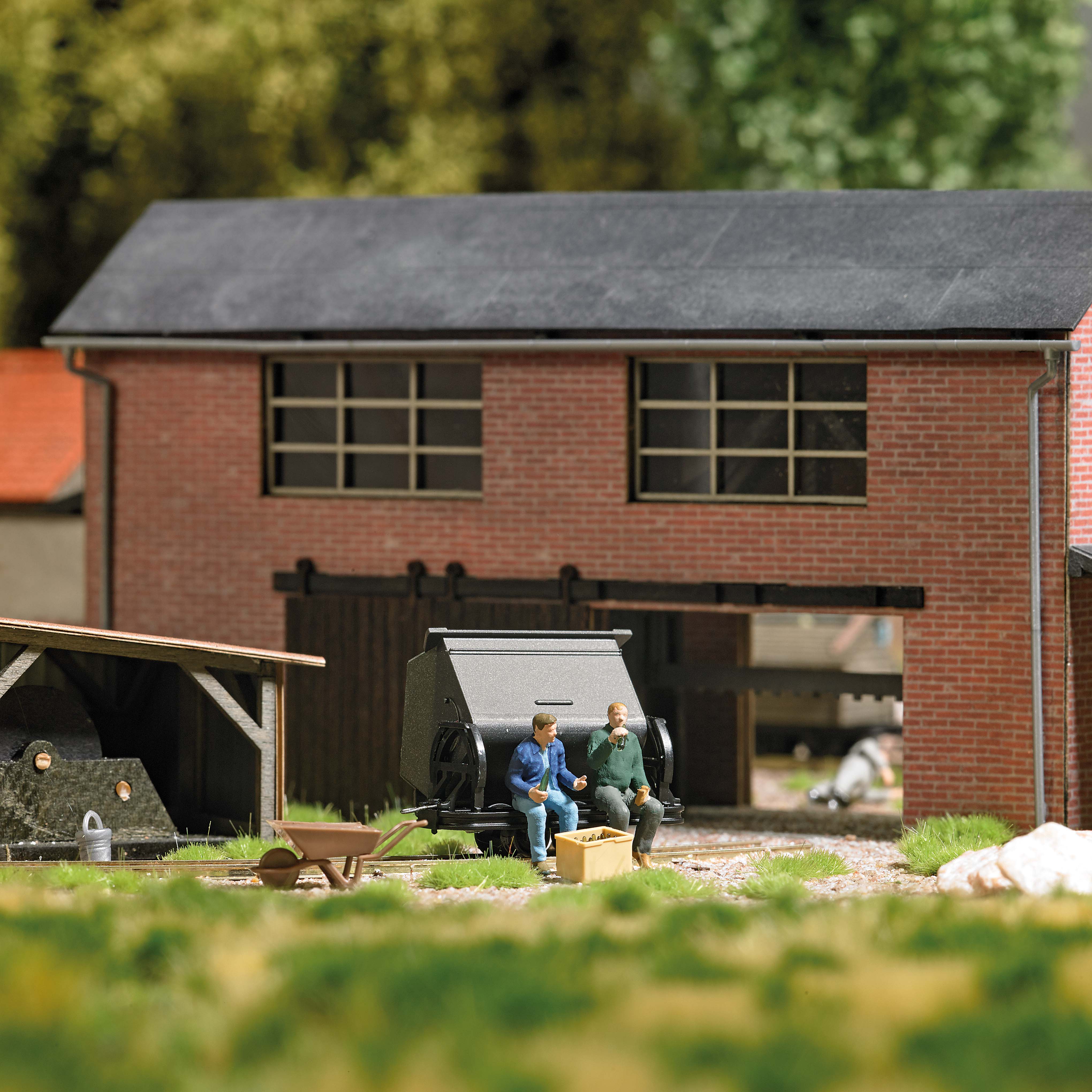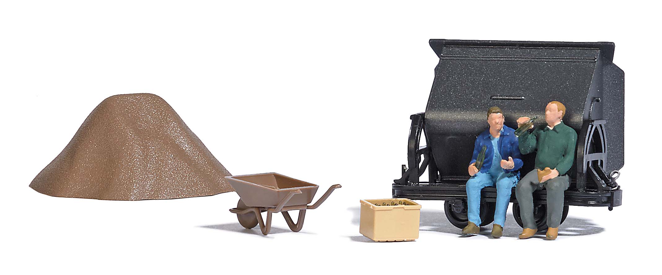 2 Arbeiter, die auf einer Kipplore Pause machen. Mit Schubkarren, Sandhaufen und Bierkasten. Länge der Lore: 29 mm.