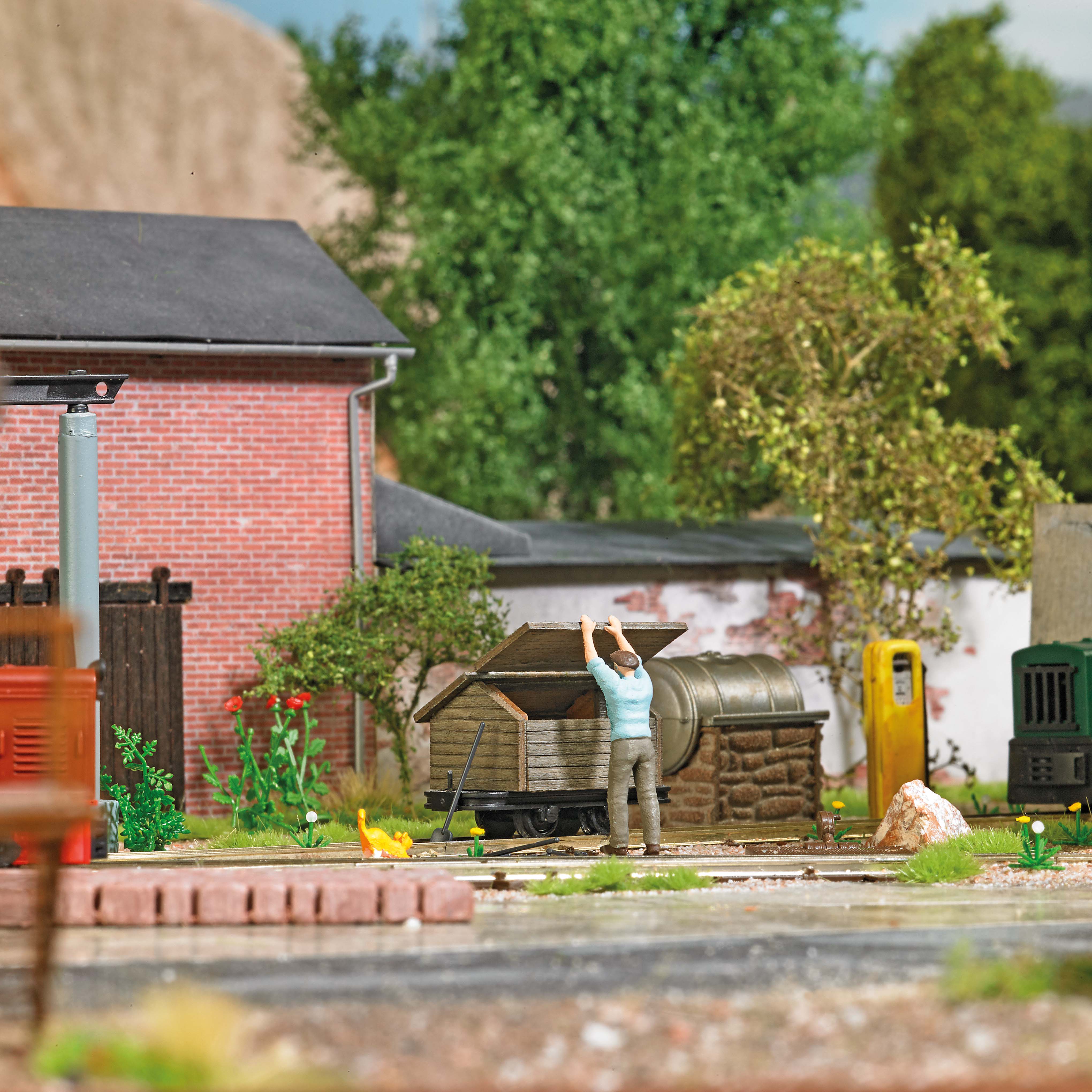 Arbeiter, der einen Werkzeugwagen öffnet. Spitzdachwagen mit Aufbau aus echtem Holz. Mit Werkzeug, Wagenlänge: 29 mm.