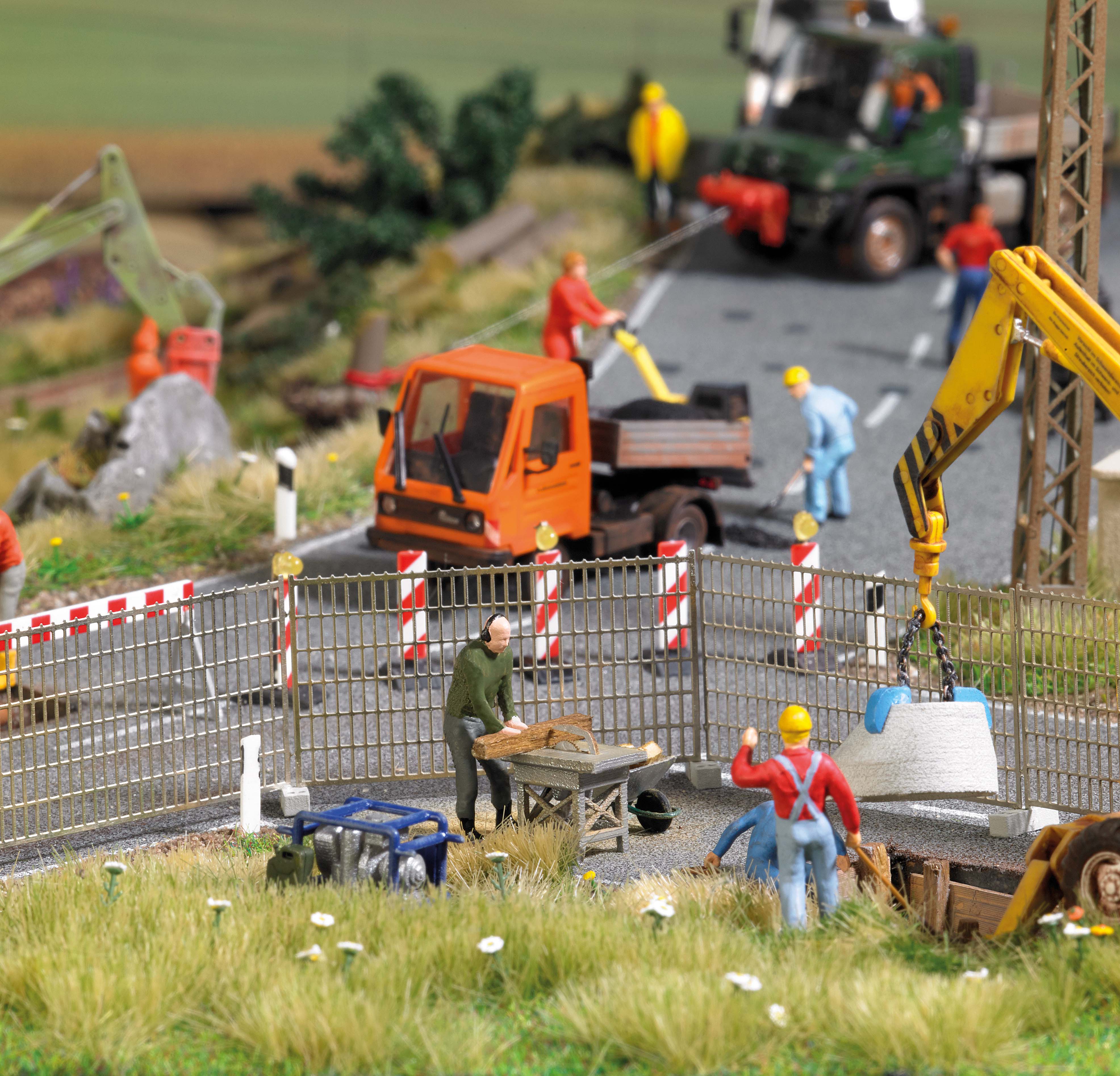 Action Set für die realistische Belebung Ihrer Modellwelt. Mittelpunkt ist das vorbildgetreue Modell eines Gerätes oder einer Maschine mit einer Figur in passender Position (bemaltes Fertigmodell) und viel Zubehör.