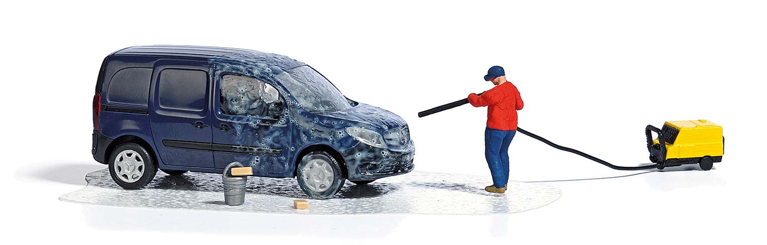 Action Set für die realistische Belebung Ihrer Modellwelt. Hier wird »gekärchert«. Autowaschszene mit eingeschäumten Mercedes Citan auf einer Schaumlache, Hochdruckreiniger, Eimer, Schwämmen und Figur.