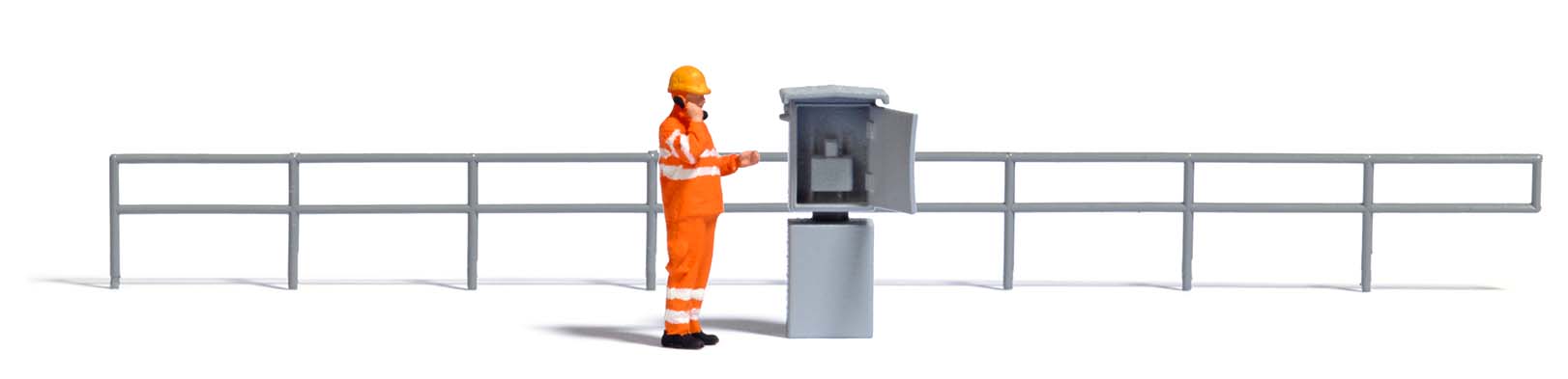 Action Set für die realistische Belebung Ihrer Modellwelt. Signalfernsprecher mit Geländer und Bahnbedienstetem der DB AG.