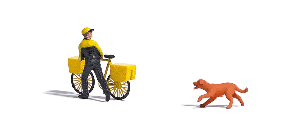 Briefzusteller mit Postfahrrad und Hund, der ihn verfolgt.