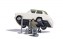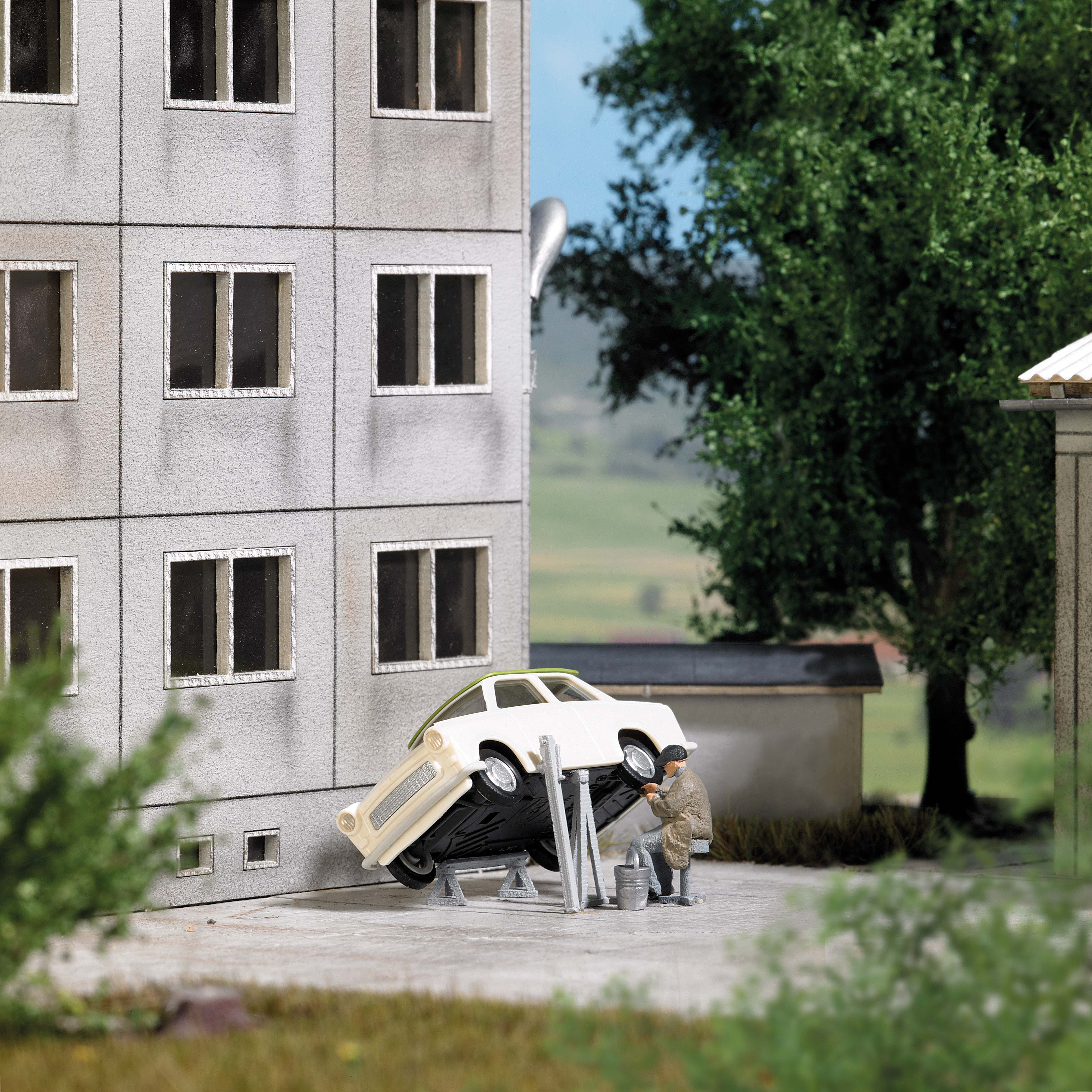 vorzugsweise an Trabant-PKW. Mit Trabant Limousine, sitzendem Monteur, Werkzeugwagen und passenden Werkzeugen.