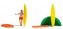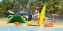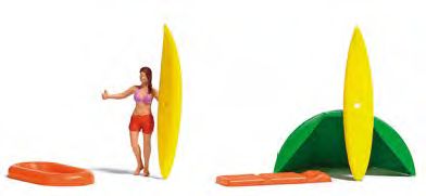 Mit Surfboards, kleinem Schlauchboot, Luftmatratze und Strandmuschel als Windschutz.