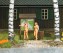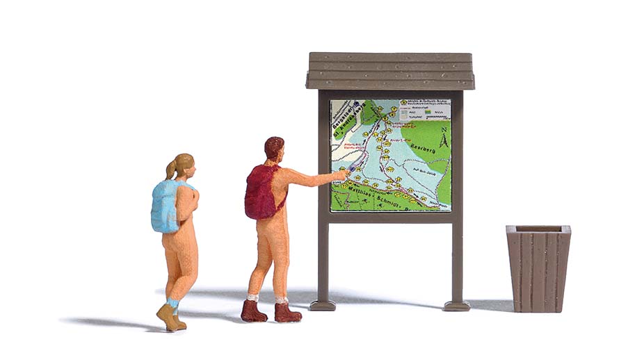 Nacktes Pärchen beim Wandern, nur mit Wanderausrüstung bekleidet. Hinweistafel mit Wanderkarte