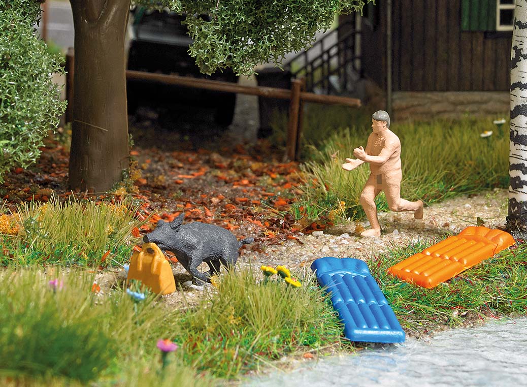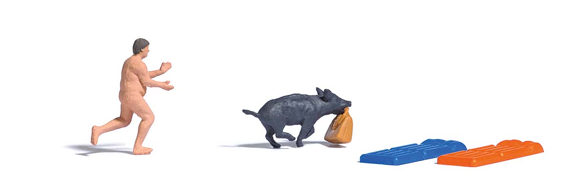 Nackter Mann verfolgt ein Wildschwein, das seine Tasche gestohlen hat. Nach einer wahren