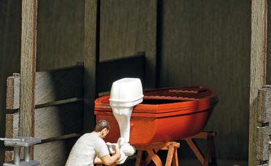 Boot, Reparaturböcken, Werkzeugwagen und Werkzeugkiste.