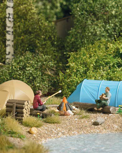 die Frau ein Stockbrot backt. Mit 2 Zelten, Baumstämmen,