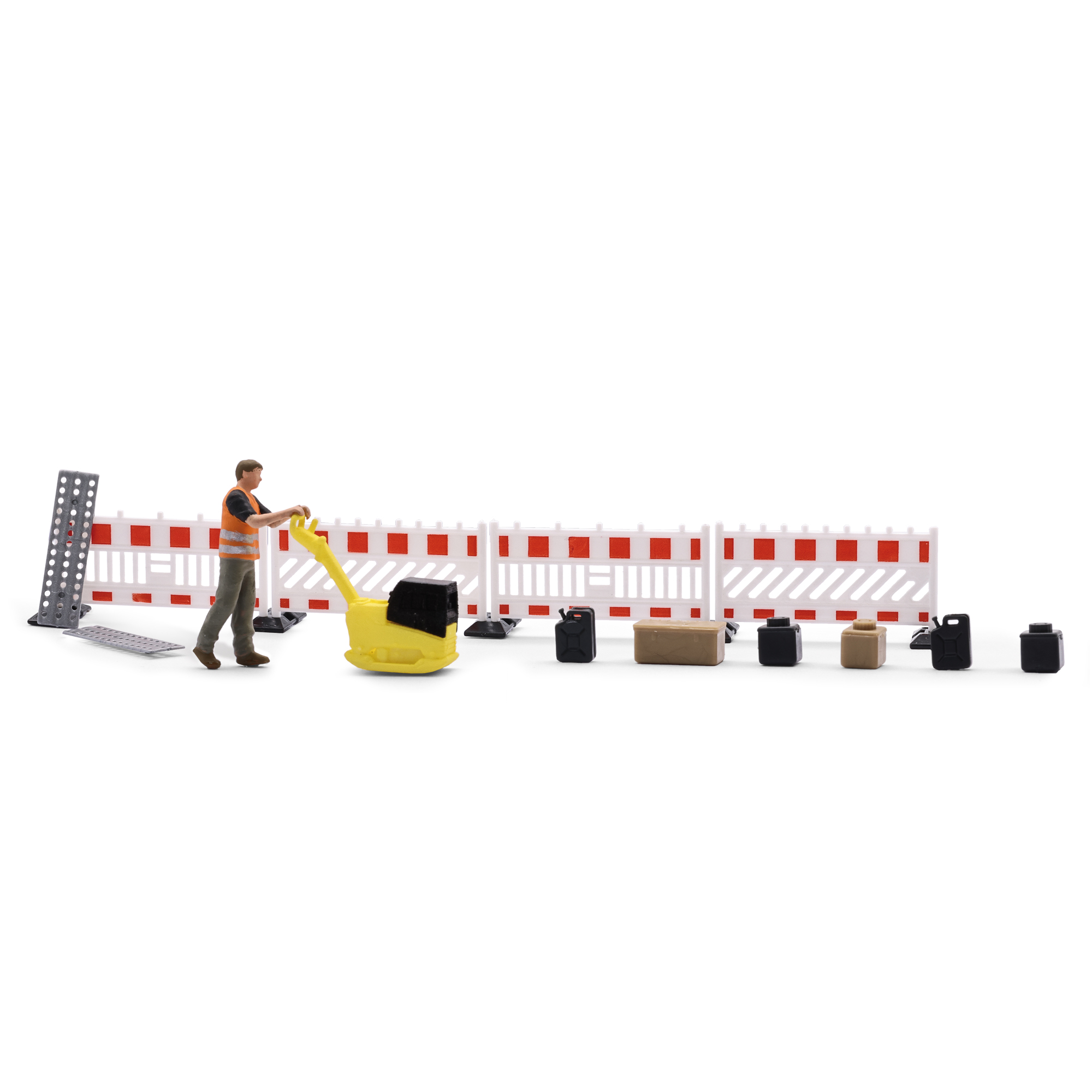 Hier wird gerüttelt, nicht gestampft! Ein Bauarbeiter bedient eine leistungsstarke Rüttelplatte, um den Untergrund für weitere Arbeiten zu verdichten. Moderner Schrankenzaun und Lochbleche sichern den Arbeitsbereich. Diverse Kisten und Kanister stehen bereit. Das detailreiche Action Set eignet sich ideal für Darstellungen der Epochen 5 und 6.