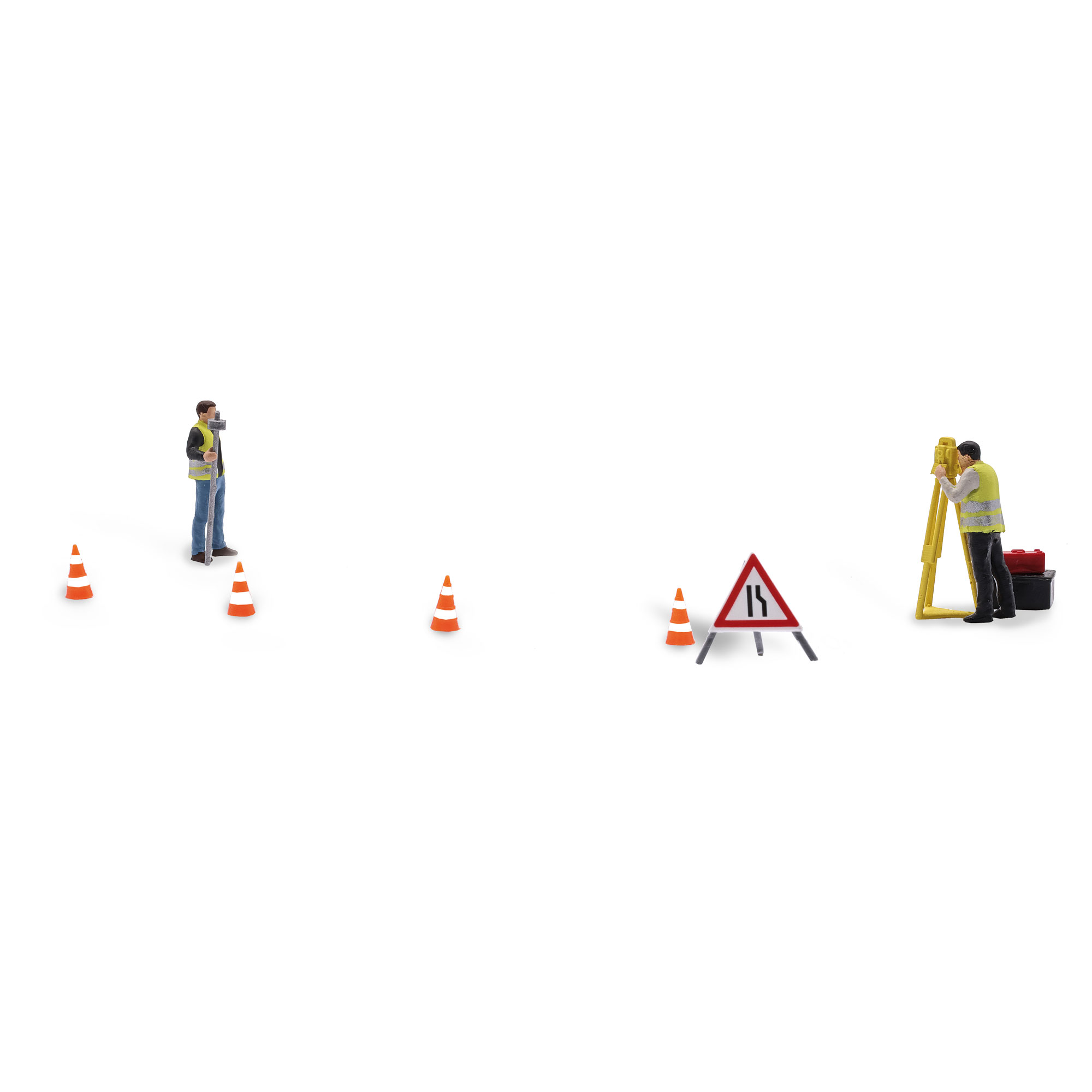 Zwei Mitarbeiter vom Vermessungsamt führen digitale Messungen für das nächste Bauprojekt durch. Ein Mitarbeiter arbeitet am Dreibein mit Vermessungsgerät während sein Kollege den Fluchtstab zur exakten Ausrichtung setzt. Leitkegel, Verkehrsschild »Verengte Fahrbahn« sowie Materialkisten sichern und ergänzen das Action Set. Geeignet für Epochen 5 und 6.