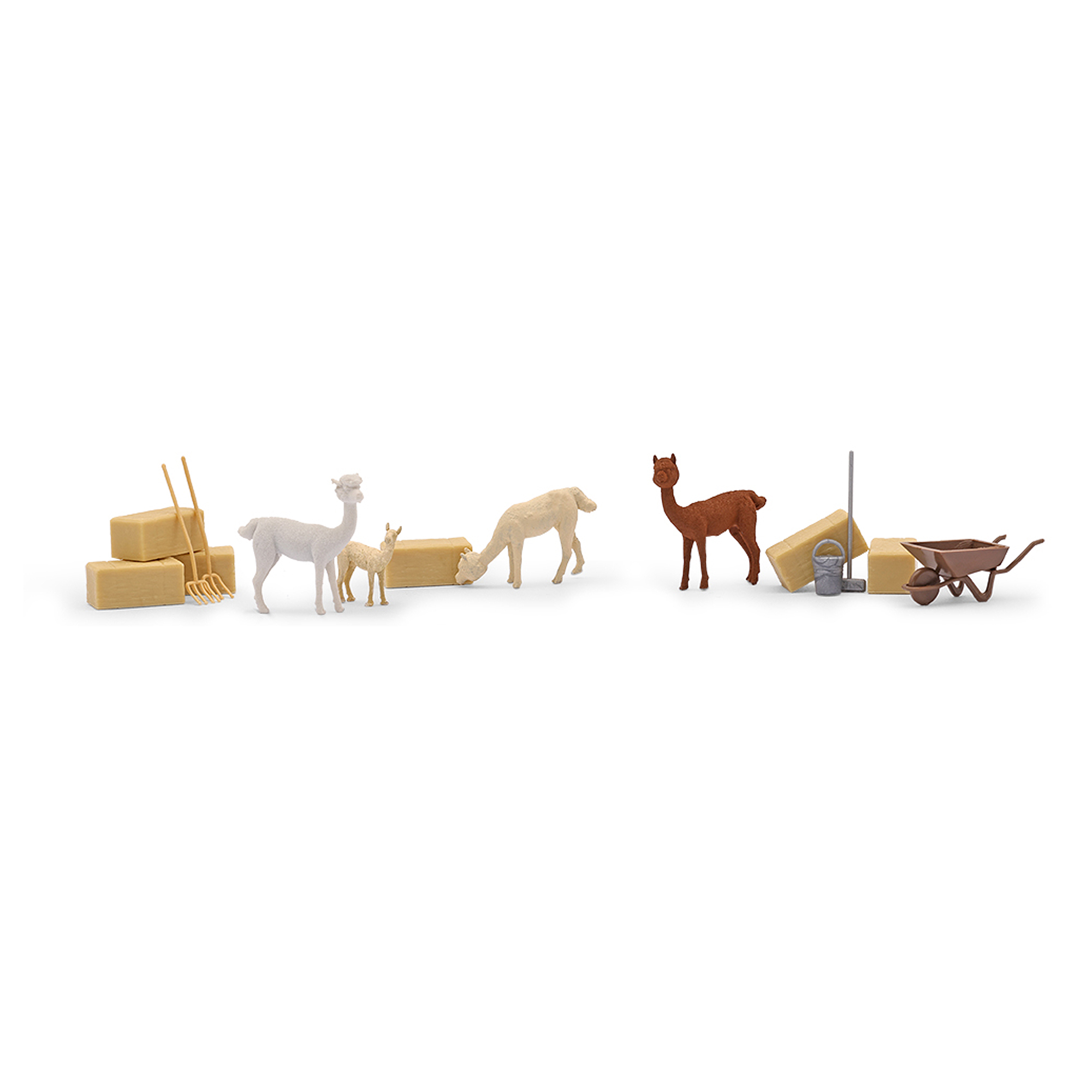 Die Alpakas sind gerade frisch geschoren worden und nun geht's raus auf die Wiese. Noch vorsichtig bleibt das Jungtier dicht bei seiner Mutter. Action Set mit 4 Alpakas, 6 Heuballen, Schub-karren, Eimer und Stallwerkzeug