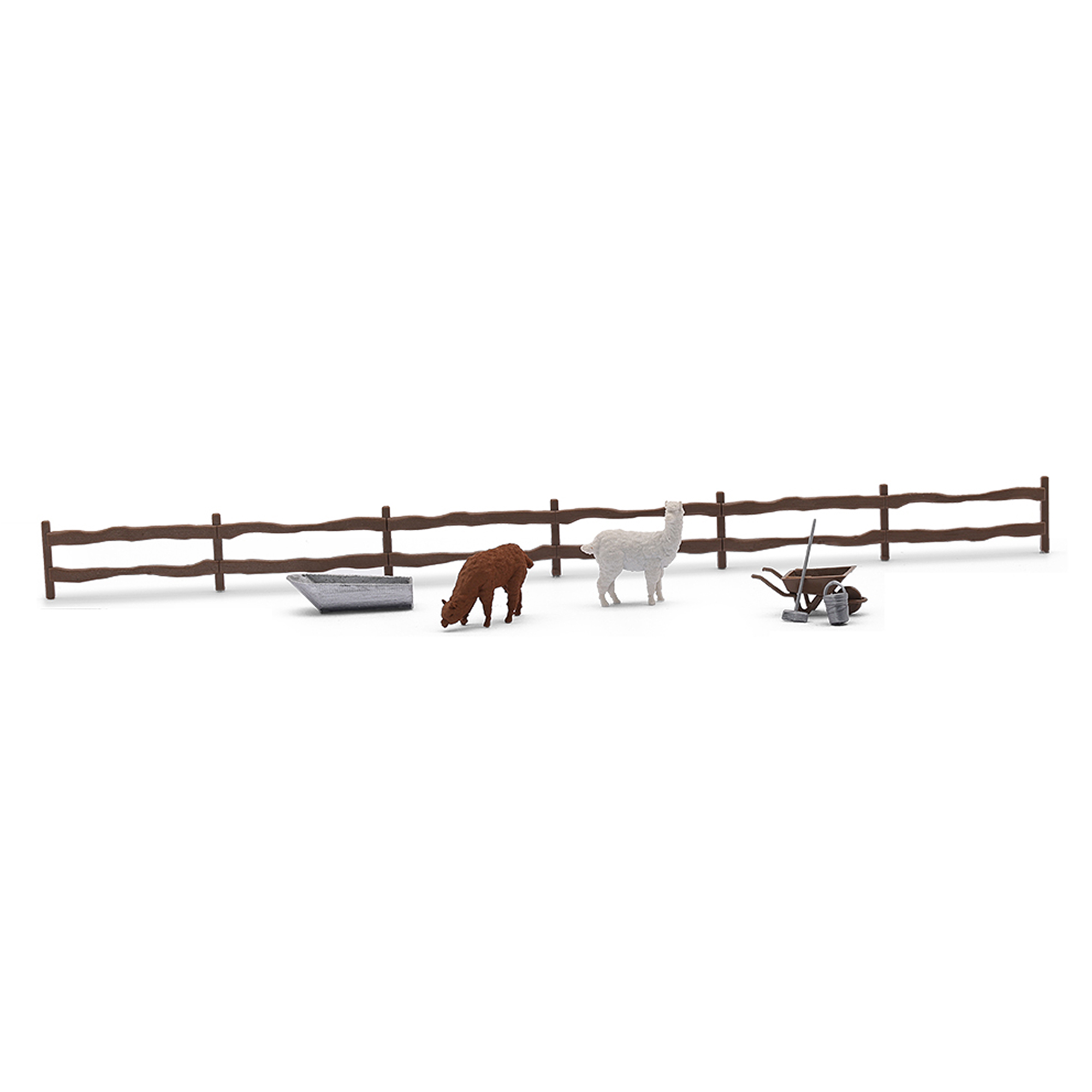 Alpakas brauchen viel Platz für ihren Auslauf und zum Grasen. Ein großzügig angelegter Weidezaun verhindert, dass sie ausbüxen können. Action Set mit 2 Alpakas, Tränke, Schubkarren, Eimer und Stallwerkzeug sowie ein Weidezaun (130 cm).