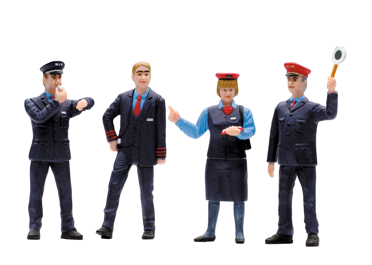 Set bestehend aus vier Figuren von Zugpersonal der SBB oder anderer schweizer Bahnen, wie z.B. der RhB.