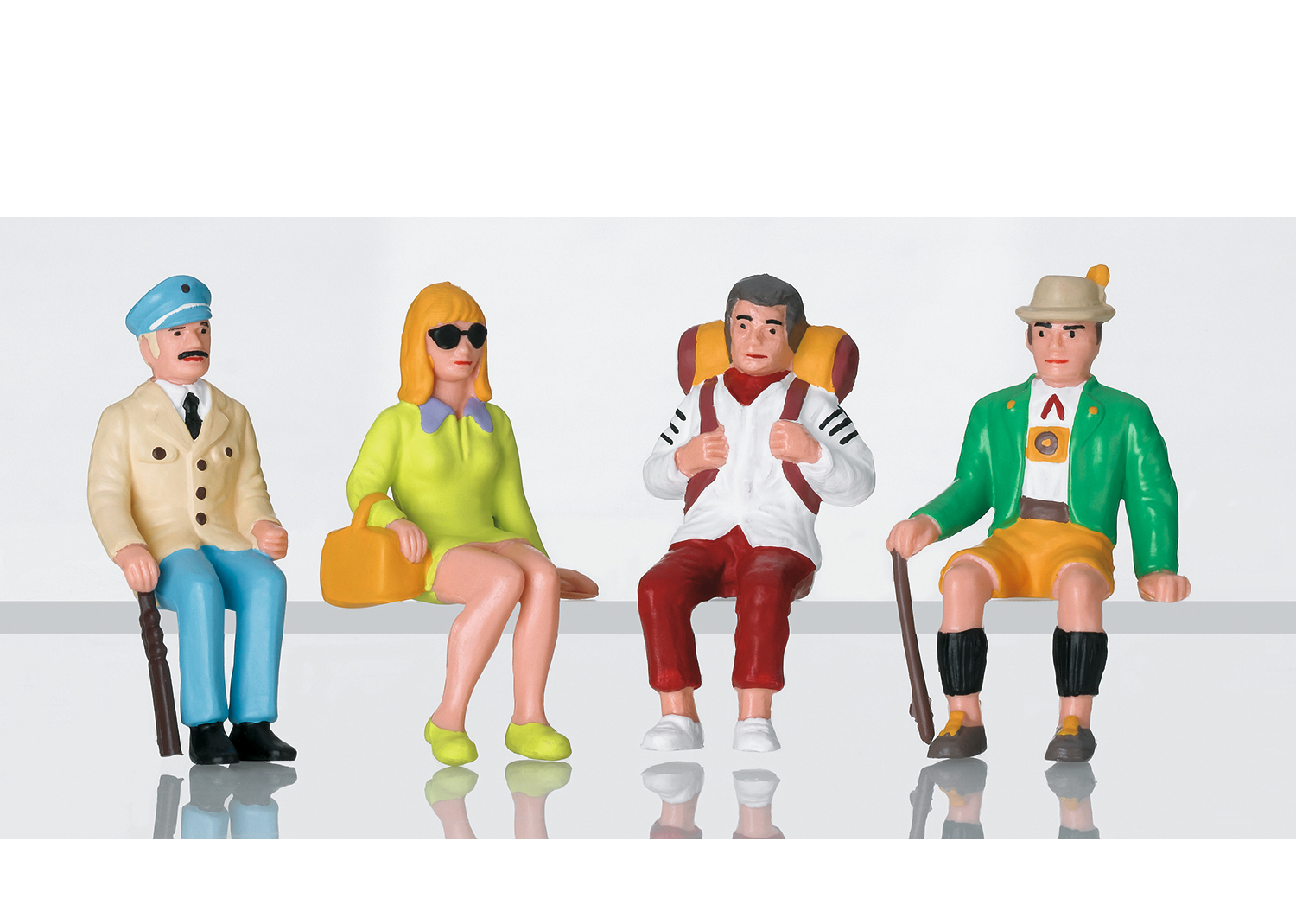 Set bestehend aus vier Figuren (sitzende Touristen), die als Reisende auf dem Bahnsteig oder auch zur vielfältigen Ausschmückung der Anlage verwendet werden können. Bänke liegen nicht bei.