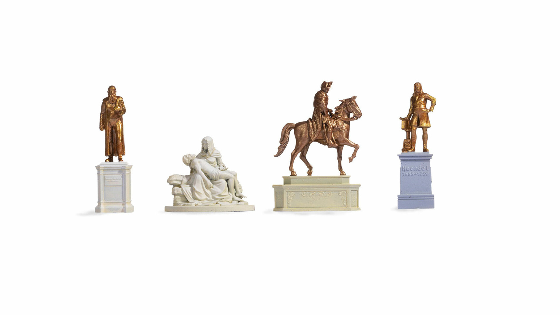 Denkmäler und Büsten prägen vielerorts das Stadtbild und sind zugleich markante Wegpunkte. Die NOCH Zubehör-Sets lassen sich vielfältig in der Modell-Landschaft einsetzen und schaffen einen attraktiven Blickfang. Büsten und Denkmäler stellen berühmte geschichtliche Persönlichkeiten und Szenen dar.