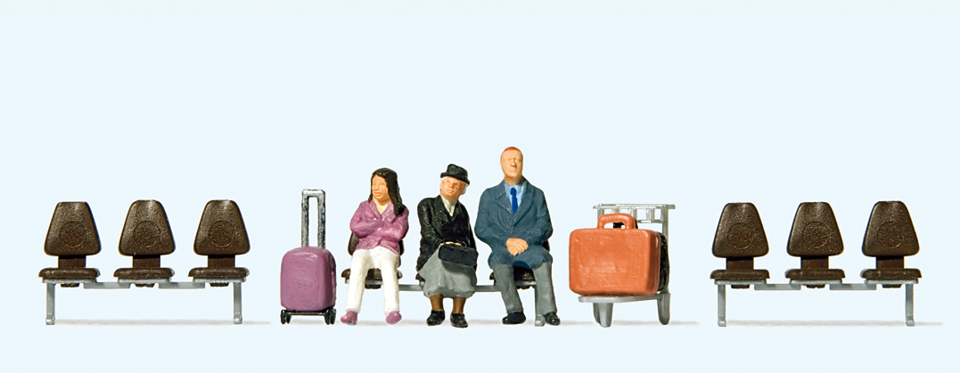 Drei wartende Reisende. Kofferkuli. Drei Sitzreihen